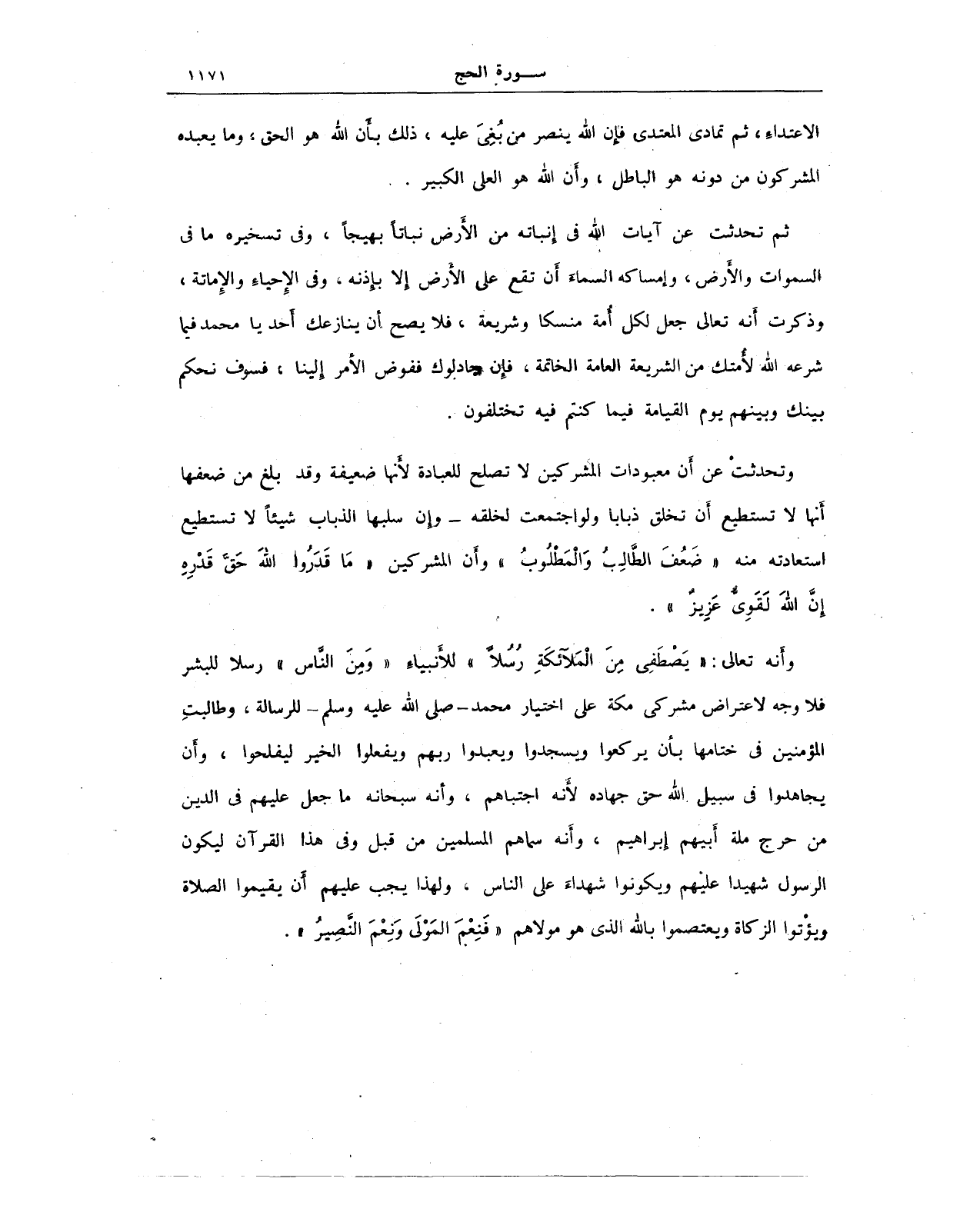 وأَنه تعالى: {يَصْطَفِي مِنَ الْمَلَائِكَةِ رُسُلًا} للأَنبياء {وَمِنَ النَّاسِ}، رسلا للبشر فلا وجه لاعتراض مشركى مكة على اختيار محمد - صلى الله عليه وسلم - للرسالة، وطالبتِ المؤمنين في ختامها بأن يركعوا ويسجدوا ويعبدوا ربهم ويفعلوا الخير ليفلحوا، وأَن يجاهدوا في سبيل الله حق جهاده لأَنه اجتباهم، وأنه سبحانه ما جعل عليهم في الدين من حرج ملة أَبيهم إِبراهيم, وأَنه سماهم المسلمين من قبل وفي هذا القرآن ليكون الرسول شهيدا عليهم ويكونوا شهداءَ على الناس، ولهذا يجب عليهم أَن يقيموا الصلاة ويؤْتوا الزكاة ويعتصموا بالله الذي هو مولاهم {فَنِعْمَ الْمَوْلَى وَنِعْمَ النَّصِيرُ}.