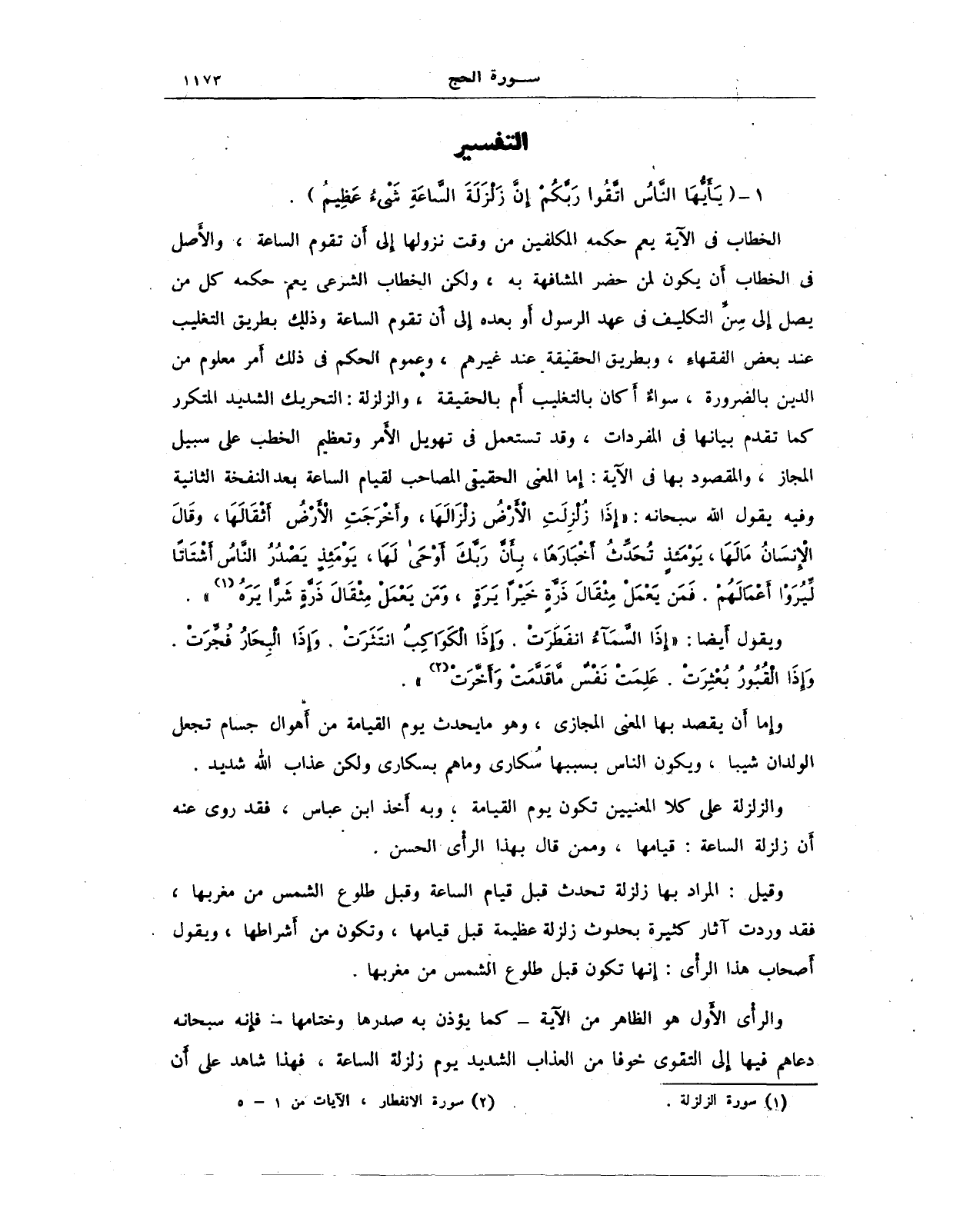 1 - {يَا أَيُّهَا النَّاسُ اتَّقُوا رَبَّكُمْ إِنَّ زَلْزَلَةَ السَّاعَةِ شَيْءٌ عَظِيمٌ}.