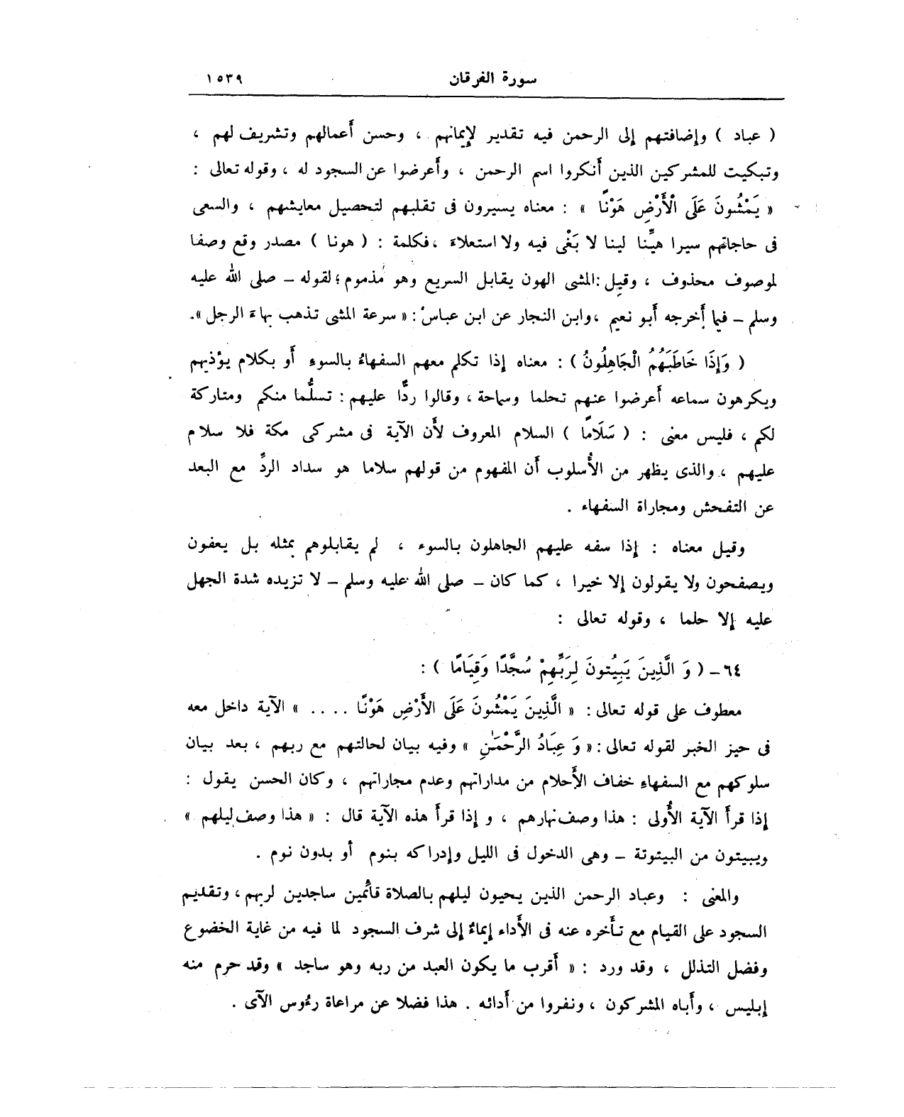 (عباد) وإِضافتهم إلى الرحمن فيه تقدير لإِيمانهم، وحسن أَعمالهم وتشريف لهم، وتبكيت للمشركين الذين أَنكروا اسم الرحمن، وأَعرضوا عن السجود له، وقوله تعالى: {يَمْشُونَ عَلَى الْأَرْضِ هَوْنًا}: معناه يسيرون في تقلبهم لتحصيل معايشهم، والسعى في حاجاتهم سيرا هيِّنا لينا لا بَغْى فيه ولا استعلاء، فكلمة: (هونا) مصدر وقع وصفا لموصوف محذوف، وقيل: المشى الهون يقابل السريع وهو مذموم؛ لقوله - صلى الله عليه وسلم - فيما أَخرجه أَبو نعيم، وابن النجار عن ابن عباس: "سرعة المشى تذهب بهاءَ الرجل".