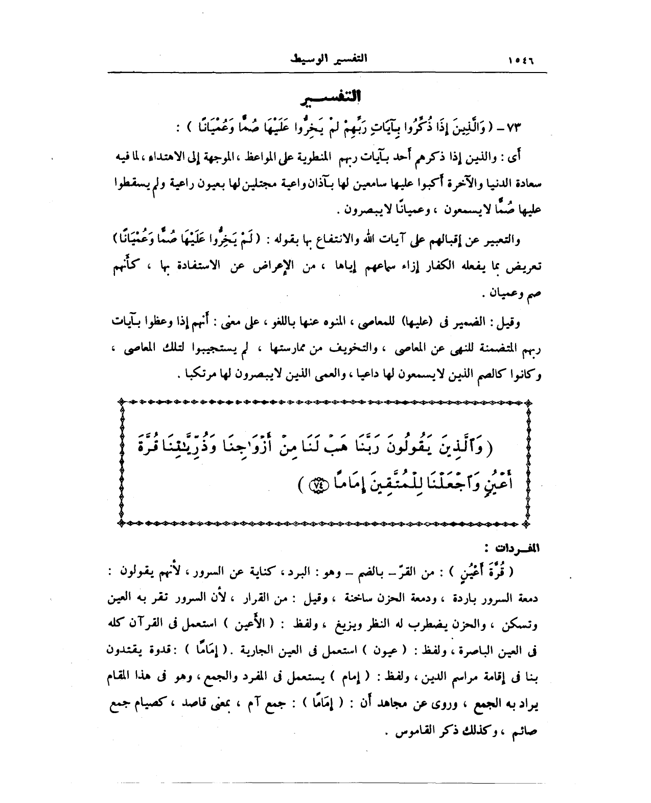 {قُرَّةَ أَعْيُنٍ}: من القرّ - بالضم - وهو: البرد، كناية عن السرور؛ لأنهم يقولون: دمعة السرور باردة، ودمعة الحزن ساخنة، وقيل: من القرار، لأن السرور تقر به العين وتسكن، والحزن يضطرب له النظر ويزيغ، ولفظ: (الأَعين) استعمل في القرآن كله في العين الباصرة، ولفظ: (عيون) استعمل في العين الجارية. (إمَامًا): قدوة يقتدون بنا في إِقامة مراسم الدين، ولفظ: (إِمام) يستعمل في المفرد والجمع، وهو في هذا المقام يراد به الجمع، وروى عن مجاهد أَن: (إمَامًا): جمع آم، بمعنى قاصد، كصيام جمع صائم، وكذلك ذكر القاموس.