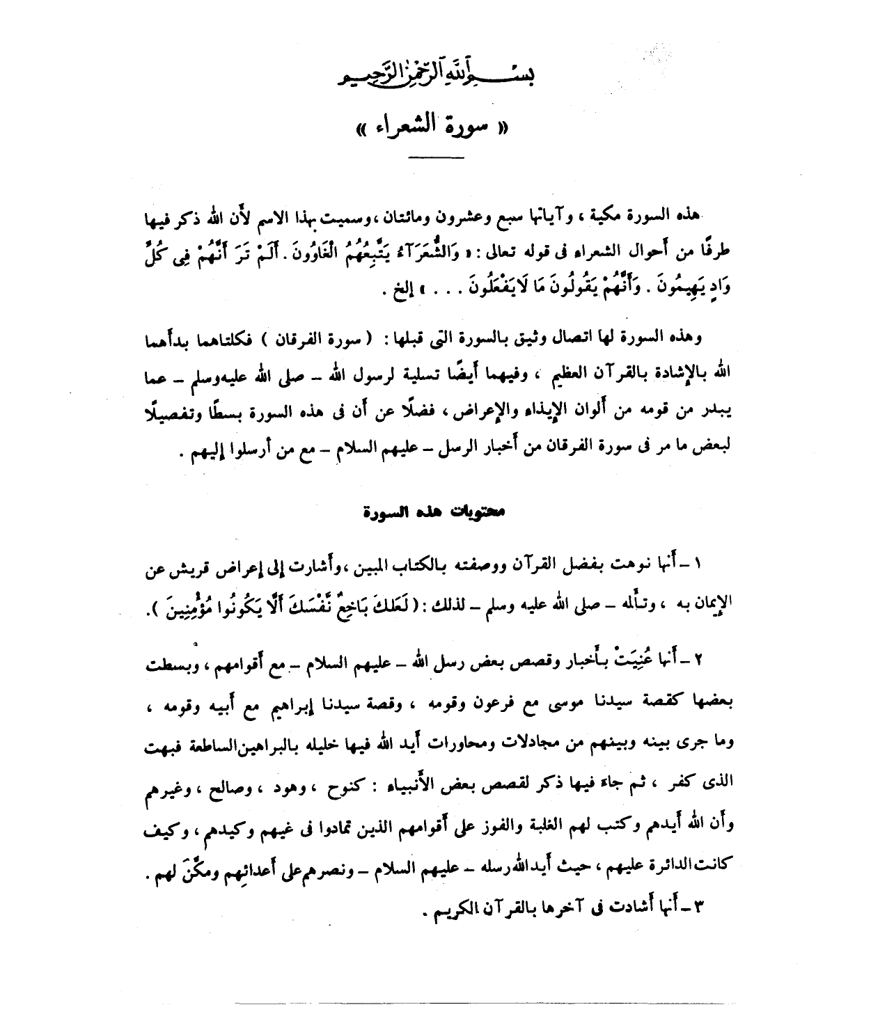 1 - أَنها نوهت بفضل القرآن ووصفته بالكتاب المبين، وأَشارت إِلى إِعراض قريش عن الإِيمان به، وتأَلمه - صلى الله عليه وسلم - لذلك: (لَعَلك بَاخِعٌ نَّفسَكَ أَلاَّ يكُونُوا مُؤْمِنِينَ).
