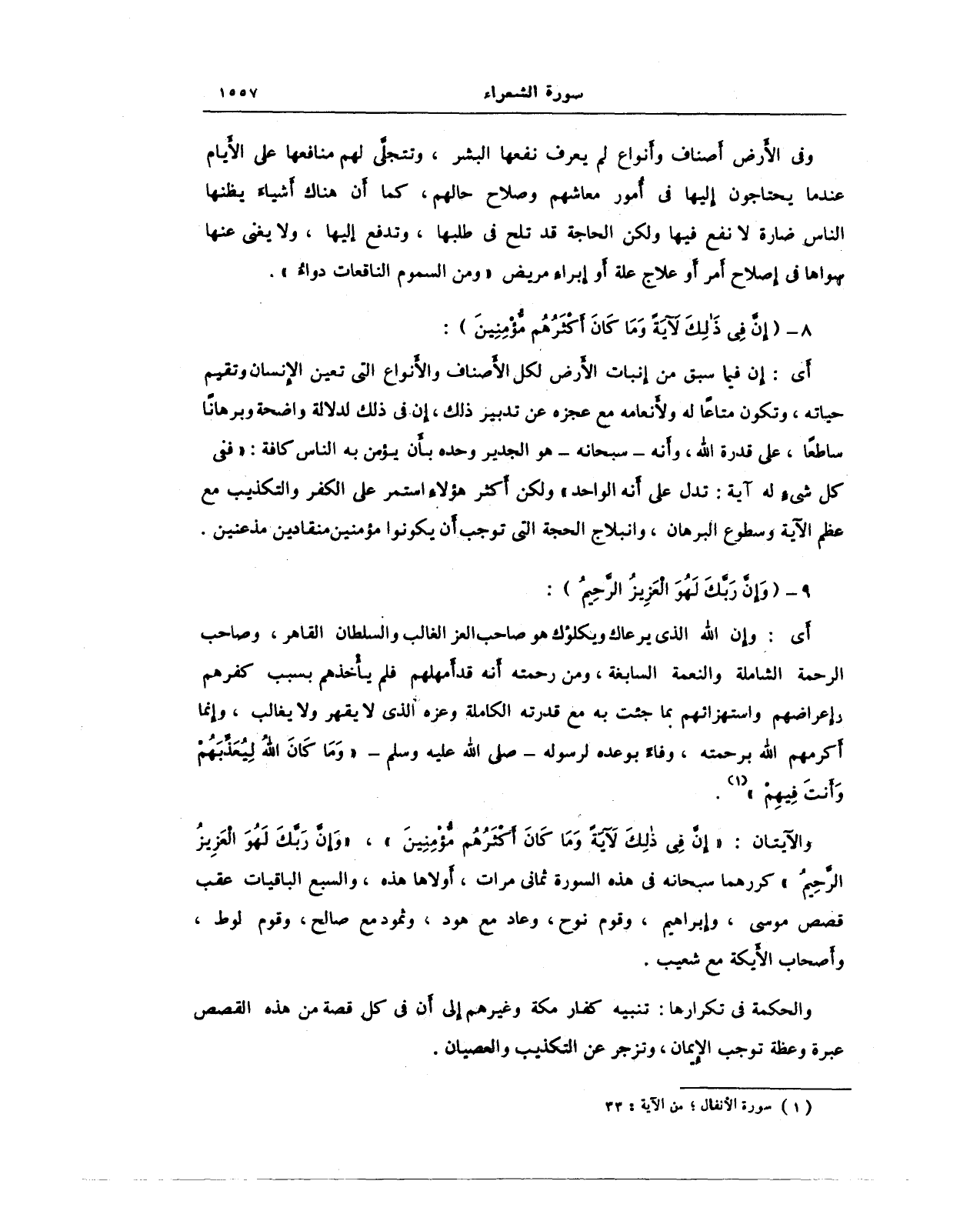 والآيتان: {إِنَّ فِي ذَلِكَ لَآيَةً وَمَا كَانَ أَكْثَرُهُمْ مُؤْمِنِينَ}، {وَإِنَّ رَبَّكَ لَهُوَ الْعَزِيزُ الرَّحِيمُ} كررهما سبحانه في هذه السورة ثماني مرات، أولاها هذه، والسبع الباقيات عقب قصص موسى، وإبراهيم، وقوم نوح، وعاد مع هود، وثمود مع صالح، وقوم لوط، وأصحاب الأيكة مع شعيب.