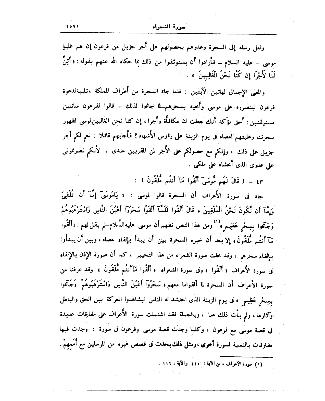 جاء في سورة الأعراف أن السحرة قالوا لموسى: {يَا مُوسَى إِمَّا أَنْ تُلْقِيَ وَإِمَّا أَنْ نَكُونَ نَحْنُ الْمُلْقِينَ (115) قَالَ أَلْقُوا فَلَمَّا أَلْقَوْا سَحَرُوا أَعْيُنَ النَّاسِ وَاسْتَرْهَبُوهُمْ وَجَاءُوا بِسِحْرٍ عَظِيمٍ} (¬1) ومن هذا النص نفهم أن موسى - عليه السلام - لم يقل لهم: {أَلْقُوا مَا أَنْتُمْ مُلْقُونَ} إلا بعد أن خيره السحرة بين أن يبدأ بإلقاء عصاه، وبين أن يبدأوا بإلقاء سحرهم، وقد خلت سورة الشعراء من هذا التخيير، كما أن صورة الإذن بالإلقاء في سورة الأعراف {ألقوا} وفي سورة الشعراء. {أَلْقُوا مَا أَنْتُمْ مُلْقُونَ} وقد عرفنا من سورة الأعراف أن السحرة لما ألقوا ما معهم {سَحَرُوا أَعْيُنَ النَّاسِ وَاسْتَرْهَبُوهُمْ وَجَاءُوا بِسِحْرٍ عَظِيمٍ} في يوم الزينة الذي احتشد له الناس ليشاهدوا المعركة بين الحق والباطل وآثارها، ولم يأت ذلك هنا، وبالجملة فقد اشتملت سورة الأعراف على مفارقات عديدة في قصة موسى مع فرعون، وكلما وجدت قصة موسى وفرعون في سورة، وجدت فيها مفارقات بالنسبة لسورة أخرى، ومثل ذلك يحدث في قصص غيره من المرسلين مع أممهم.