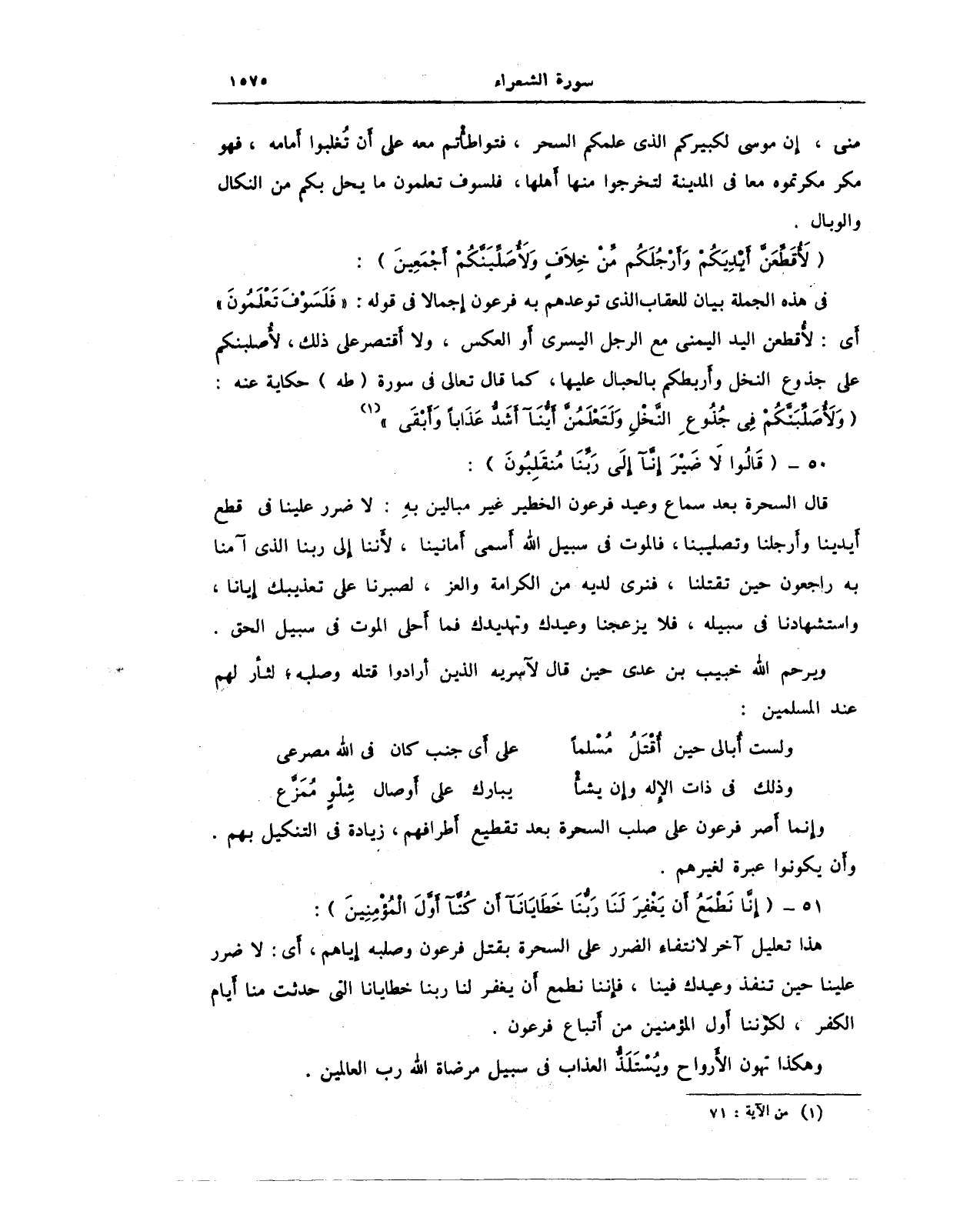 في هذه الجملة بيان للعقاب الذي توعدهم به فرعون إجمالا في قوله: {فَلَسَوْفَ تَعْلَمُونَ} أي: لأُقطعن اليد اليمنى مع الرجل اليسرى أو العكس، ولا أقتصر على ذلك، لأصلبنكم على جذوع النخل وأربطكم بالحبال عليها، كما قال تعالى في سورة (طه) حكايته عنه: {وَلَأُصَلِّبَنَّكُمْ فِي جُذُوعِ النَّخْلِ وَلَتَعْلَمُنَّ أَيُّنَا أَشَدُّ عَذَابًا وَأَبْقَى} (¬1).