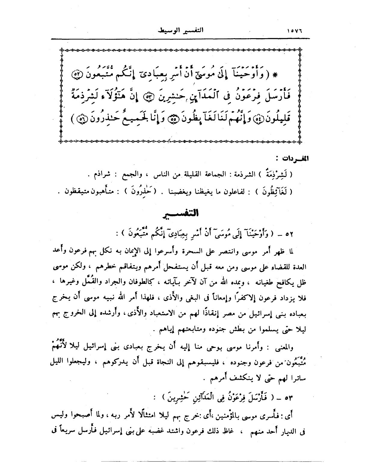 {وَأَوْحَيْنَا إِلَى مُوسَى أَنْ أَسْرِ بِعِبَادِي إِنَّكُمْ مُتَّبَعُونَ (52) فَأَرْسَلَ فِرْعَوْنُ فِي الْمَدَائِنِ حَاشِرِينَ (53) إِنَّ هَؤُلَاءِ لَشِرْذِمَةٌ قَلِيلُونَ (54) وَإِنَّهُمْ لَنَا لَغَائِظُونَ (55) وَإِنَّا لَجَمِيعٌ حَاذِرُونَ (56)}