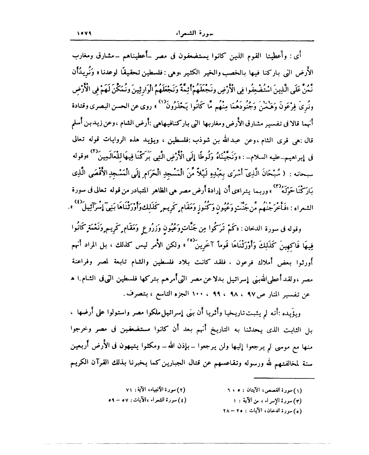 وقوله في سورة الدخان: {كَمْ تَرَكُوا مِنْ جَنَّاتٍ وَعُيُونٍ (25) وَزُرُوعٍ وَمَقَامٍ كَرِيمٍ (26) وَنَعْمَةٍ كَانُوا فِيهَا فَاكِهِينَ (27) كَذَلِكَ وَأَوْرَثْنَاهَا قَوْمًا آخَرِينَ} (¬5) ولكن الأمر ليس كذلك، بل المراد أنهم أُورثوا بعض أملاك فرعون، فلقد كانت بلاد فلسطين والشام تابعة لمصر وفراعنة مصر، ولقد أعطى الله بني إسرائيل بدلا عن مصر التي أمرهم بتركها فلسطين التي في الشام. أ. هـ عن تفسير المنار ص 97، 98، 99، 100 الجزء التاسع، بتصرف.