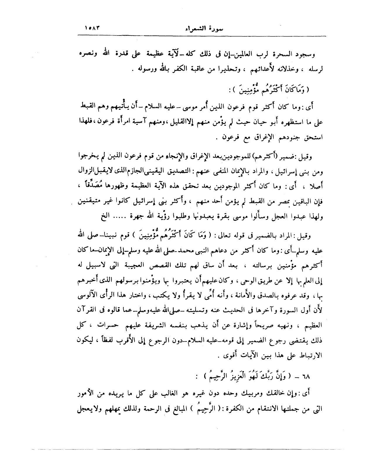 وقيل: المراد بالضمير في قوله تعالى: {وَمَا كَانَ أَكْثَرُهُمْ مُؤْمِنِينَ} قوم نبينا - صلى الله عليه وسلم - أي: وما كان أكثر من دعاهم النبي محمد - صلى الله عليه وسلم - إلى الإيمان - ما كان أكثرهم مؤمنين برسالته، بعد أن ساق لهم تلك القصص العجيبة التي لا سبيل له إلى العلم بها إلا عن طريق الوحى، وكان عليهم أن يعتبروا بها ويؤمنوا برسولهم الذي أخبرهم بها، وقد عرفوه بالصدق والأمانة، وأنه أُمِّي لا يقرأ ولا يكتب، واختار هذا الرأى الآلوسى لأن أول السورة وآخرها في الحديث عنه وتسليته - صلى الله عليه وسلم - عما قالوه في القرآن العظيم، ونهيه صريحًا وإشارة عن أن يذهب بنفسه الشريفة عليهم حسرات، كل ذلك يقتضي رجوع الضمير إلى قومه - عليه السلام - دون الرجوع إلى الأقرب لفظًا، ليكون الارتباط على هذا بين الآيات أقوى.