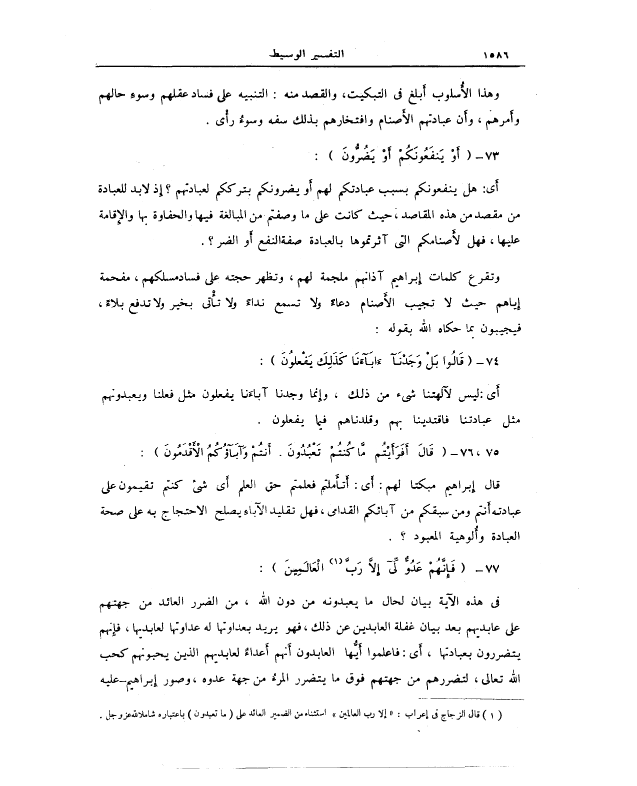 (¬1) قال الزجاج في إعراب: "إلا رب العالمين" استثناء من الضمير العائد على (ما تعبدون) باعتباره شاملا لله عز وجل.