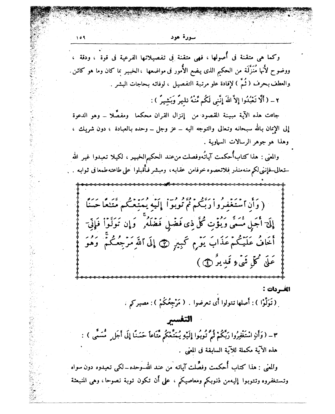 والمعنى: هذا كتاب أُحكمت وفصِّلت آياته من عند الله - وحده - لكي تعبدوه دون سواه وتستغفروه وتتوبوا إليه من ذنوبكم ومعاصيكم، على أَن تكون توبة نصوحا، وهى المنبعثة