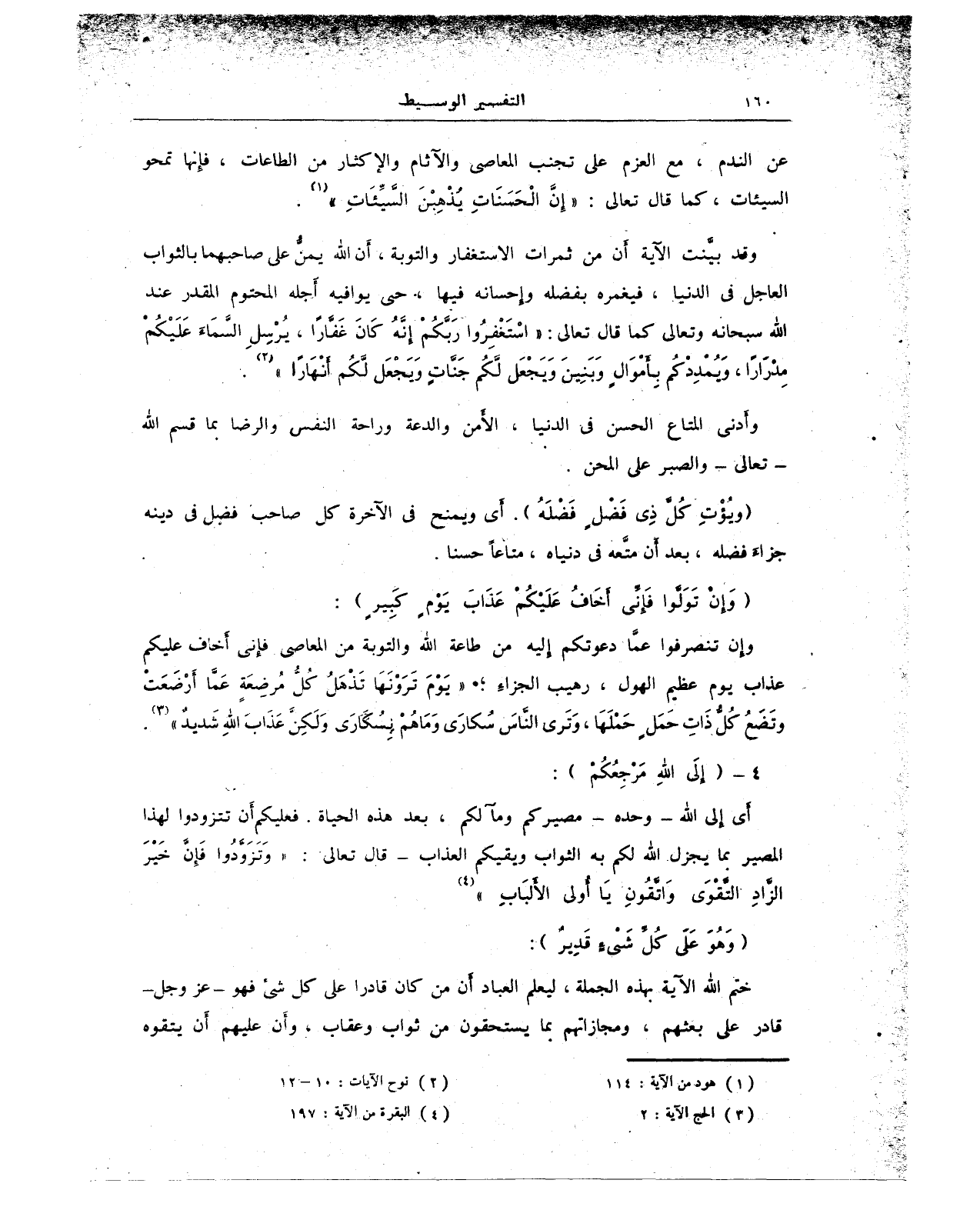 وقد بينت الآية أن من ثمرات الاستغفار والتوبة، أن الله يمنُّ على صاحبهما بالثواب العاجل في الدنيا، فيغمره بفضله وإِحسانه فيها، حى يوافيه أجله المحتوم المقدر عند الله سبحانه وتعالى كما قال تعالى: {فَقُلْتُ اسْتَغْفِرُوا رَبَّكُمْ إِنَّهُ كَانَ غَفَّارًا يُرْسِلِ السَّمَاءَ عَلَيْكُمْ مِدْرَارًا وَيُمْدِدْكُمْ بِأَمْوَالٍ وَبَنِينَ وَيَجْعَلْ لَكُمْ جَنَّاتٍ وَيَجْعَلْ لَكُمْ أَنْهَارًا} (¬2).
