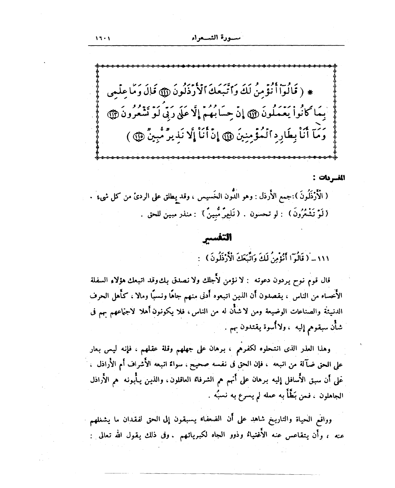 {قَالُوا أَنُؤْمِنُ لَكَ وَاتَّبَعَكَ الْأَرْذَلُونَ (111) قَالَ وَمَا عِلْمِي بِمَا كَانُوا يَعْمَلُونَ (112) إِنْ حِسَابُهُمْ إِلَّا عَلَى رَبِّي لَوْ تَشْعُرُونَ (113) وَمَا أَنَا بِطَارِدِ الْمُؤْمِنِينَ (114) إِنْ أَنَا إِلَّا نَذِيرٌ مُبِينٌ (115)}