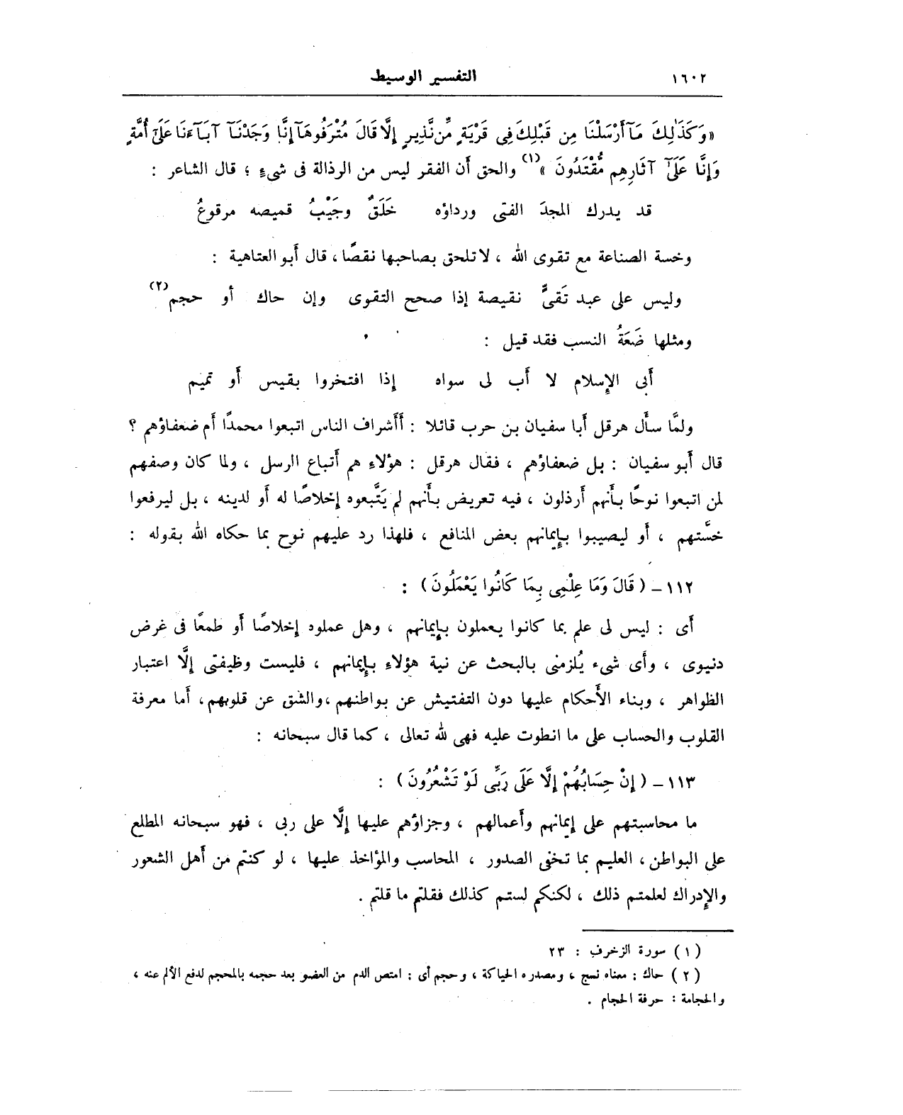 ولمَّا سأل هرقل أبا سفيان بن حرب قائلا: أأشراف الناس اتبعوا محمدًا أم ضعفاؤهم؟ قال أبو سفيان: بل ضعفاؤهم، فقال هرقل: هؤلاء هم اتباع الرسل، ولما كان وصفهم لمن اتبعوا نوحًا بأنهم أرذلون، فيه تعريض بأنهم لم يتَّبعوه إخلاصًا له أو لدينه، بل ليرفعوا خسَّتهم، أو ليصيبوا بإيمانهم بعض المنافع، فلهذا رد عليهم نوح بما حكاه الله بقوله: