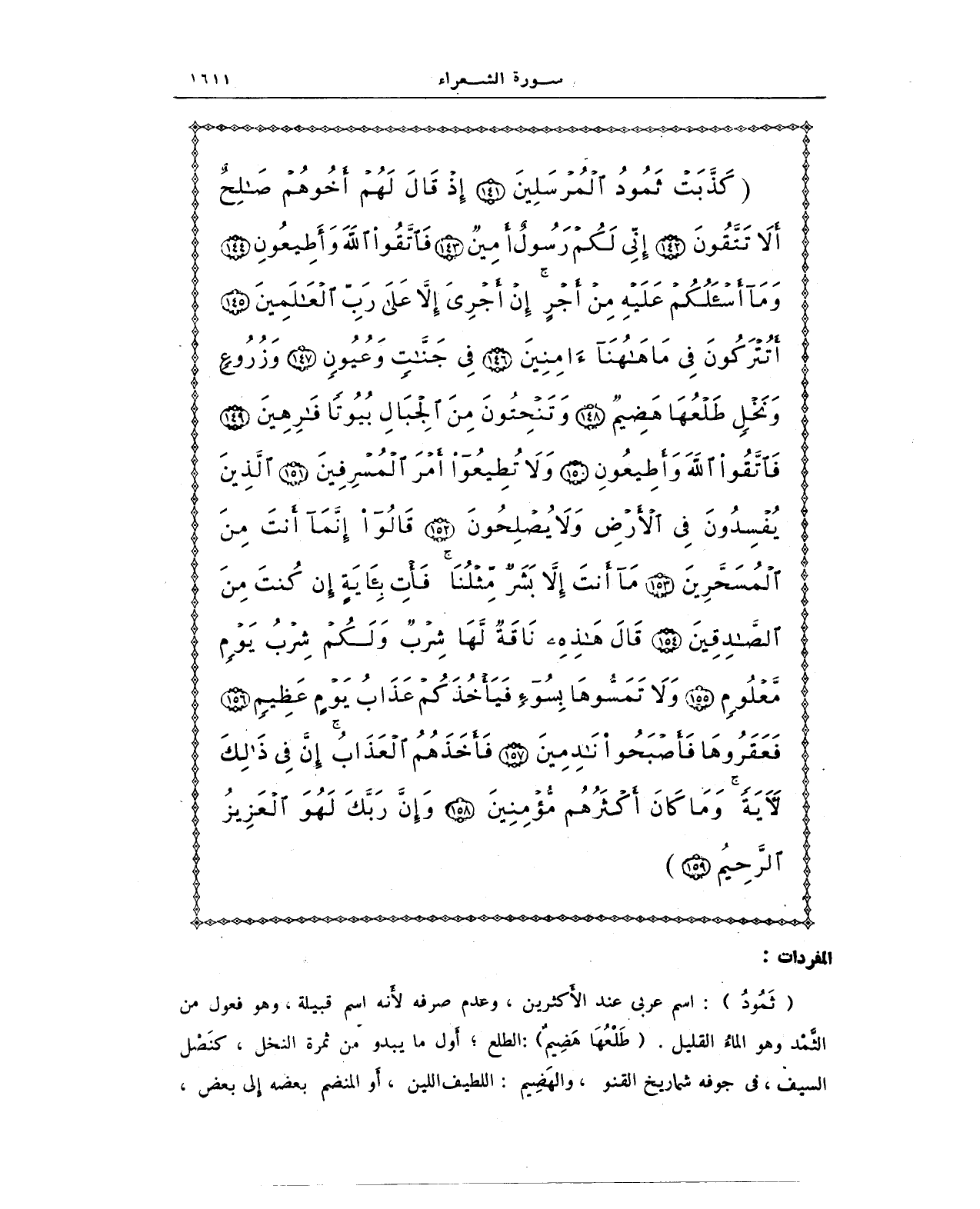 {كَذَّبَتْ ثَمُودُ الْمُرْسَلِينَ (141) إِذْ قَالَ لَهُمْ أَخُوهُمْ صَالِحٌ أَلَا تَتَّقُونَ (142) إِنِّي لَكُمْ رَسُولٌ أَمِينٌ (143) فَاتَّقُوا اللَّهَ وَأَطِيعُونِ (144) وَمَا أَسْأَلُكُمْ عَلَيْهِ مِنْ أَجْرٍ إِنْ أَجْرِيَ إِلَّا عَلَى رَبِّ الْعَالَمِينَ (145) أَتُتْرَكُونَ فِي مَا هَاهُنَا آمِنِينَ (146) فِي جَنَّاتٍ وَعُيُونٍ (147) وَزُرُوعٍ وَنَخْلٍ طَلْعُهَا هَضِيمٌ (148) وَتَنْحِتُونَ مِنَ الْجِبَالِ بُيُوتًا فَارِهِينَ (149) فَاتَّقُوا اللَّهَ وَأَطِيعُونِ (150) وَلَا تُطِيعُوا أَمْرَ الْمُسْرِفِينَ (151) الَّذِينَ يُفْسِدُونَ فِي الْأَرْضِ وَلَا يُصْلِحُونَ (152) قَالُوا إِنَّمَا أَنْتَ مِنَ الْمُسَحَّرِينَ (153) مَا أَنْتَ إِلَّا بَشَرٌ مِثْلُنَا فَأْتِ بِآيَةٍ إِنْ كُنْتَ مِنَ الصَّادِقِينَ (154) قَالَ هَذِهِ نَاقَةٌ لَهَا شِرْبٌ وَلَكُمْ شِرْبُ يَوْمٍ مَعْلُومٍ (155) وَلَا تَمَسُّوهَا بِسُوءٍ فَيَأْخُذَكُمْ عَذَابُ يَوْمٍ عَظِيمٍ (156) فَعَقَرُوهَا فَأَصْبَحُوا نَادِمِينَ (157) فَأَخَذَهُمُ الْعَذَابُ إِنَّ فِي ذَلِكَ لَآيَةً وَمَا كَانَ أَكْثَرُهُمْ مُؤْمِنِينَ (158) وَإِنَّ رَبَّكَ لَهُوَ الْعَزِيزُ الرَّحِيمُ (159)} وَإِنَّ رَبَّكَ لَهُوَ الْعَزِيزُ الرَّحِيمُ}