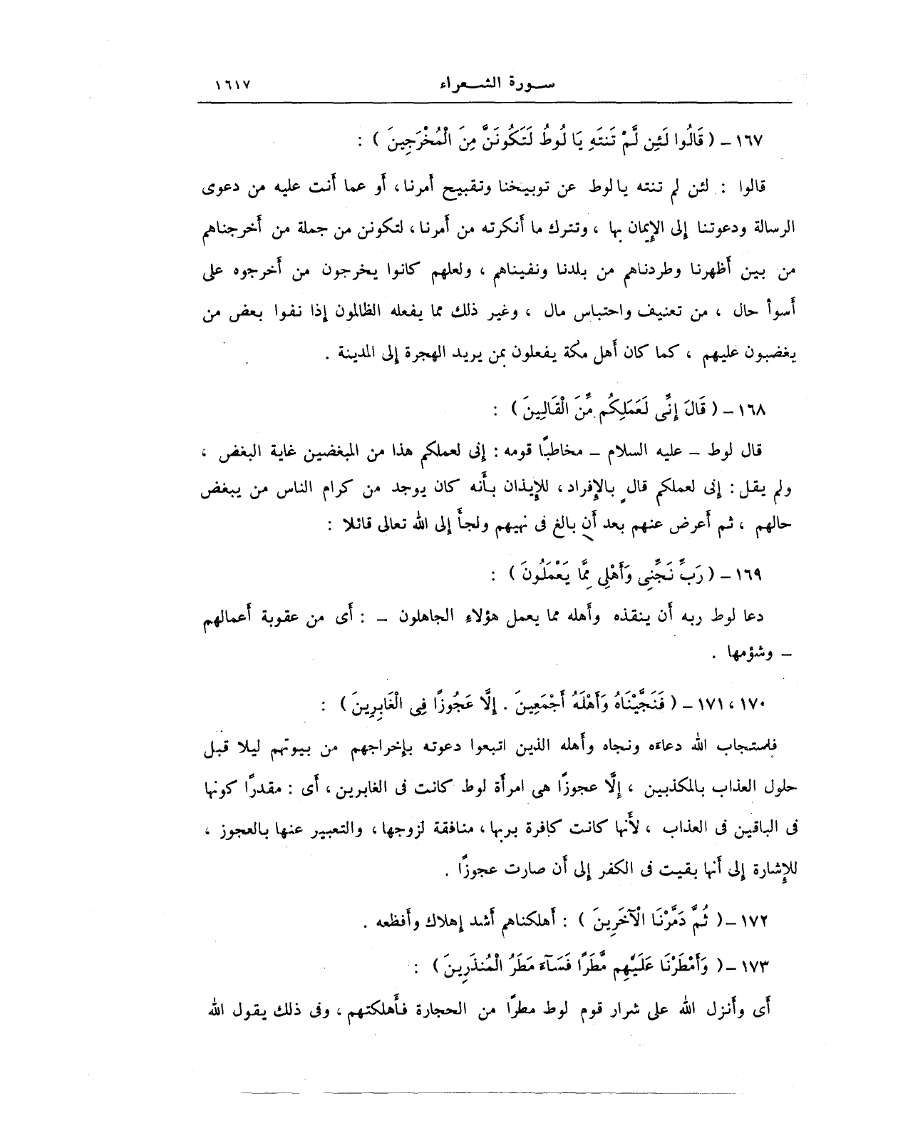 قال لوط - عليه السلام - مخاطبًا قومه: إني لعملكم هذا من المبغضين غاية البغض, ولم يقل: إني لعملكم قال بالإفراد، للإيذان بأنه كان يوجد من كرام الناس من يبغض حالهم، ثم أعرض عنهم بعد أن بالغ في نهيهم ولجأ إلى الله تعالى قائلًا: