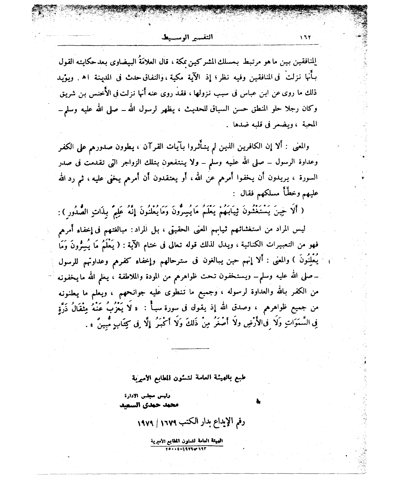 ليس المراد من استغشائهم ثيابهم المعنى الحقيقى، بل المراد: مبالغتهم في إِخفاء أَمرهم فهو من التعبيرات الكنائية، ويدل لذلك قوله تعالى في ختام الآية: {يَعْلَمُ مَا يُسِرُّونَ وَمَا يُعْلِنُونَ} والمعنى: ألا إنهم حين يبالغون في ستر حالهم وإِخفاءِ كفرهم وعداوتهم للرسول - صلى الله عليه وسلم - ويستخفون تحت ظواهرهم من المودة والملاطفة، يعلم الله ما يخفونه من الكفر باللهِ والعداوة لرسوله، وجميع ما تنطوى عليه جوانحهم، ويعلم ما يعلنونه من جميع ظواهرهم، وصدق الله إذ يقول في سورة سبأ: {لَا يَعْزُبُ عَنْهُ مِثْقَالُ ذَرَّةٍ فِي السَّمَاوَاتِ وَلَا فِي الْأَرْضِ وَلَا أَصْغَرُ مِنْ ذَلِكَ وَلَا أَكْبَرُ إِلَّا فِي كِتَابٍ مُبِينٍ}.