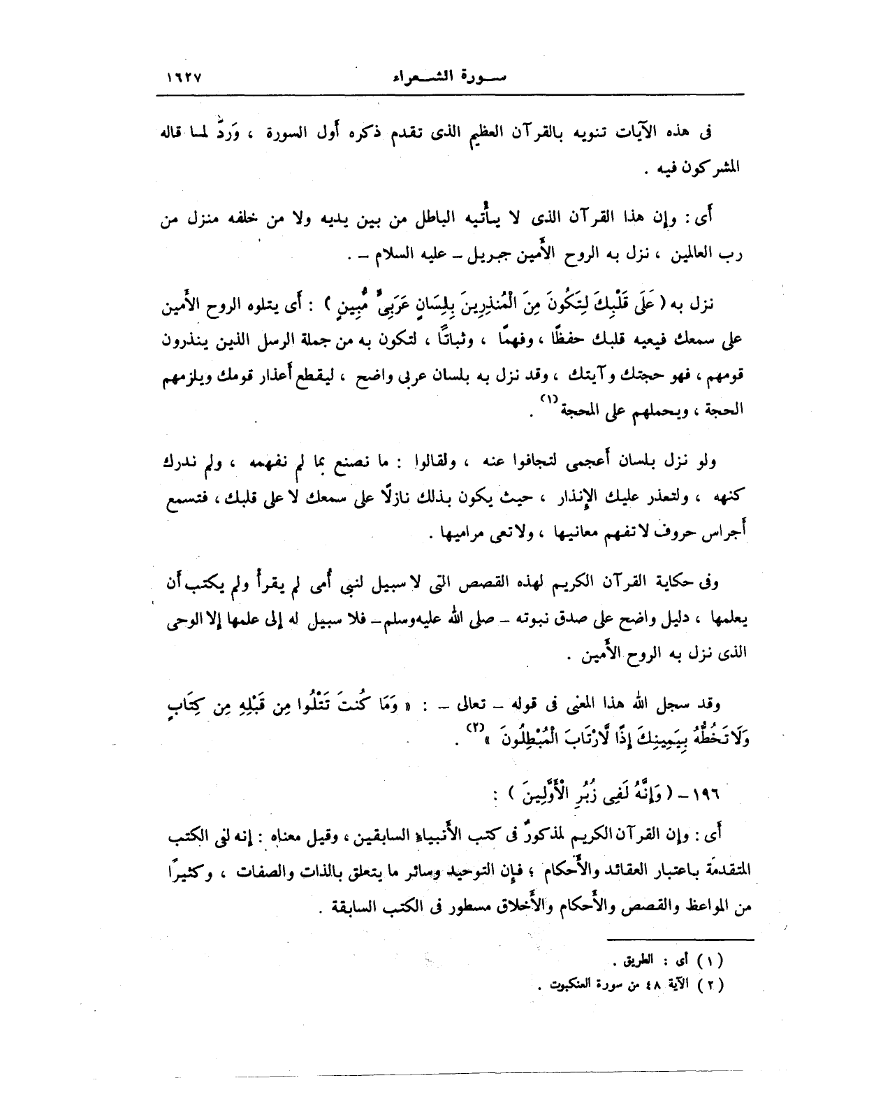 نزل به {عَلَى قَلْبِكَ لِتَكُونَ مِنَ الْمُنْذِرِينَ. بِلِسَانٍ عَرَبِيٍّ مُبِينٍ}: أي يتلوه الروح الأَمين على سمعك فيعيه قلبك حفطًا، وفهمًا، وثباتًا، لتكون به من جملة الرسل الذين ينذرون قومهم، فهو حجتك وآيتك، وقد نزل به بلسان عربى واضح، ليقطع أعذار قومك ويلزمهم الحجة، ويحملهم على المحجة (¬1).