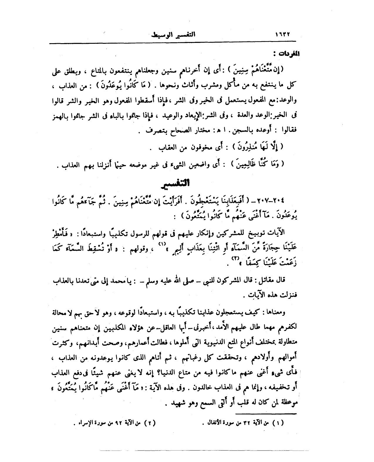 {إِنْ مَتَّعْنَاهُمْ سِنِينَ}: أَي إن أَخرناهم سنين وجعلناهم ينتفعون بالمتاع، ويطلق على كل ما ينتفع به من مأْكل ومشرب وأَثاث ونحوها. {مَا كَانُوا يُوعَدُونَ}: من العذاب، والوعد: مع المفعول يستعمل في الخير وفي الشر، فإِذا أَسقطوا المفعول وهو الخير والشر قالوا في الخير: الوعد والعدة، وفي الشر: الإيعاد والوعيد، فإذا جاءُوا بالباء في الشر جاءوا بالهمز فقالوا: أوعده بالسجن. اهـ: مختار الصحاح بتصرف.