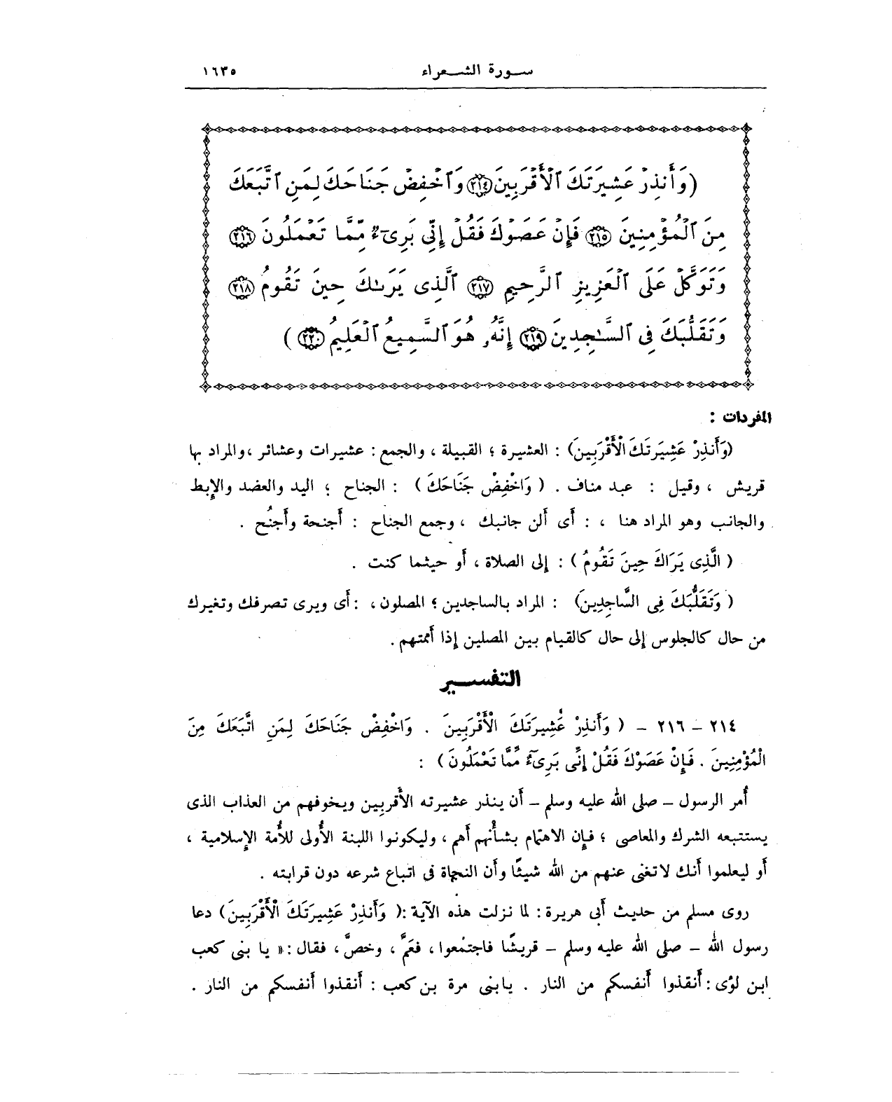 {وَأَنْذِرْ عَشِيرَتَكَ الْأَقْرَبِينَ (214) وَاخْفِضْ جَنَاحَكَ لِمَنِ اتَّبَعَكَ مِنَ الْمُؤْمِنِينَ (215) فَإِنْ عَصَوْكَ فَقُلْ إِنِّي بَرِيءٌ مِمَّا تَعْمَلُونَ (216) وَتَوَكَّلْ عَلَى الْعَزِيزِ الرَّحِيمِ (217) الَّذِي يَرَاكَ حِينَ تَقُومُ (218) وَتَقَلُّبَكَ فِي السَّاجِدِينَ (219) إِنَّهُ هُوَ السَّمِيعُ الْعَلِيمُ}