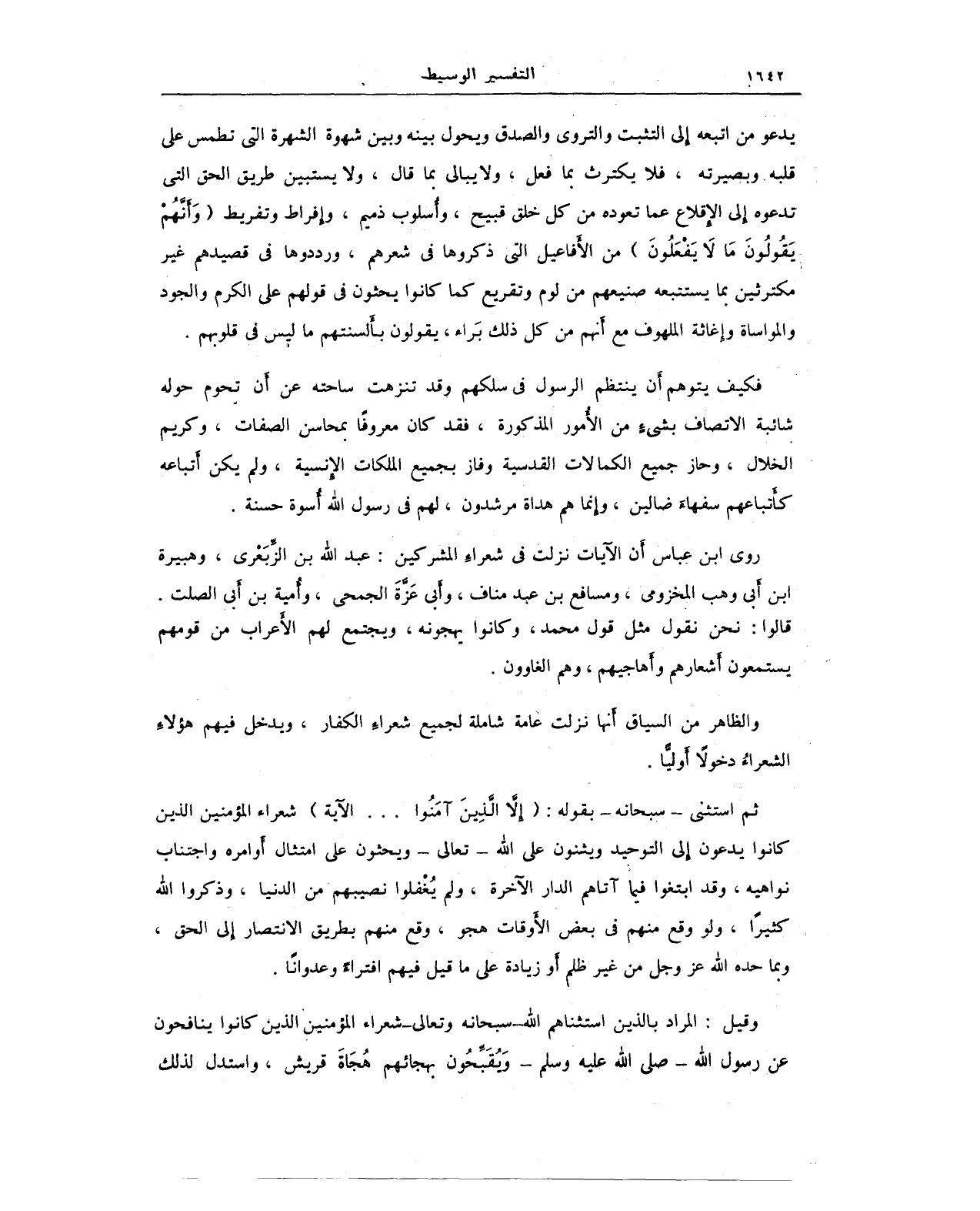 ثم استثنى - سبحانه - بقوله: {إِلَّا الَّذِينَ آمَنُوا ... الآية) شعراء المؤمنين الذين كانوا يدعون إلى التوحيد ويثنون على الله - تعالى - ويحثون على امتثال أَوامره واجتناب نواهيه، وقد ابتغوا فيما آتاهم الدار الآخرة، ولم يُغْفلوا نصيبهم من الدنيا، وذكروا الله كثرًا، ولو وقع منهم في بعض الأَوقات هجو، وقع منهم بطريق الانتصار إِلى الحق، وبما حده الله عَزَّ وَجَلَّ من غير ظلم أَو زيادة على ما قيل فيهم افتراءً وعدوانًا.