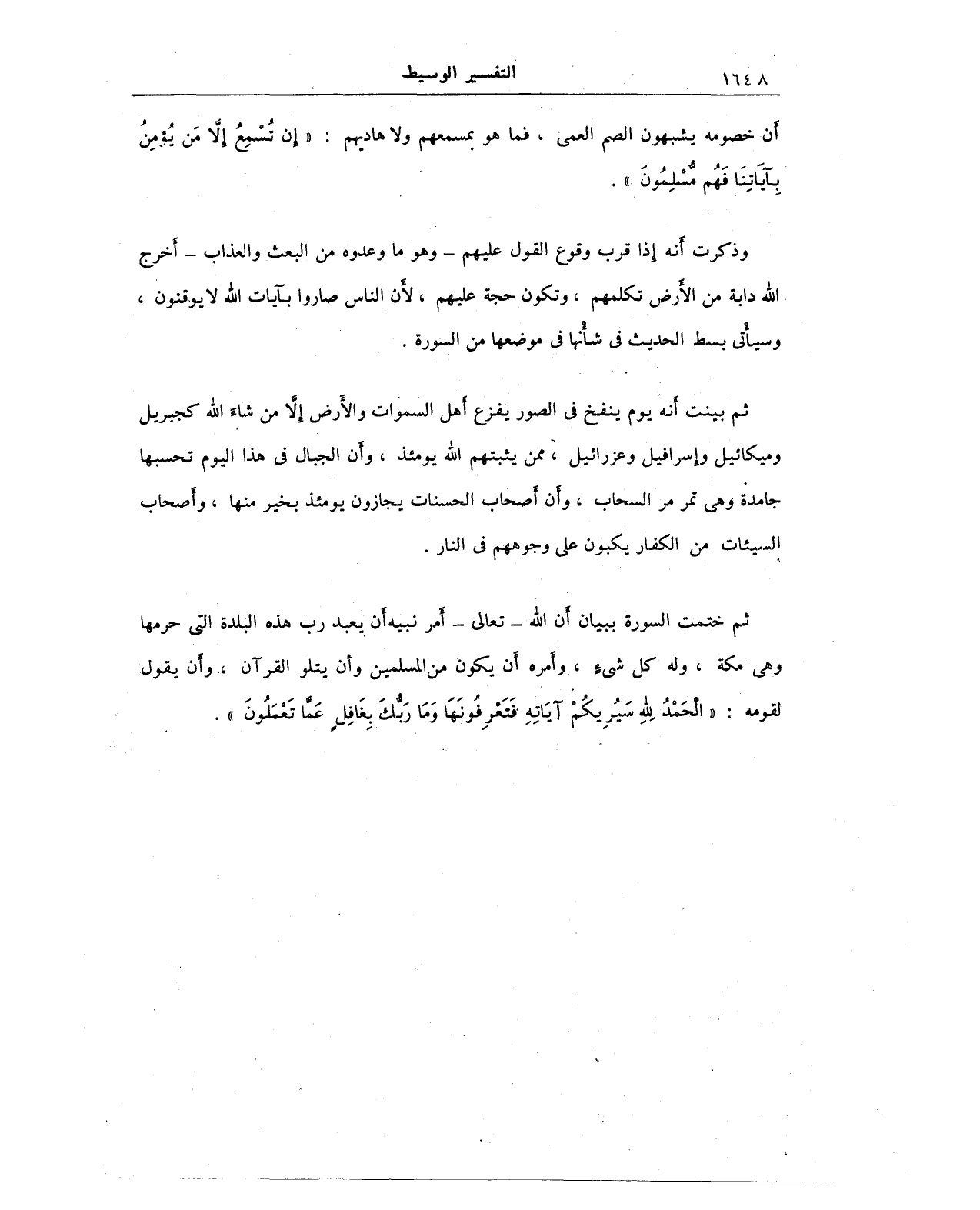 ثم ختمت السورة ببيأَن أَن الله - تعالى - أَمر نبيه أَن يعبد رب هذه البلدة التي حرمها وهي مكة، وله كل شيء، وأَمره أَن يكون من المسلمين وأَن يتلو القرآن، وأَن يقول لقومه: {وَقُلِ الْحَمْدُ لِلَّهِ سَيُرِيكُمْ آيَاتِهِ فَتَعْرِفُونَهَا وَمَا رَبُّكَ بِغَافِلٍ عَمَّا تَعْمَلُونَ}.