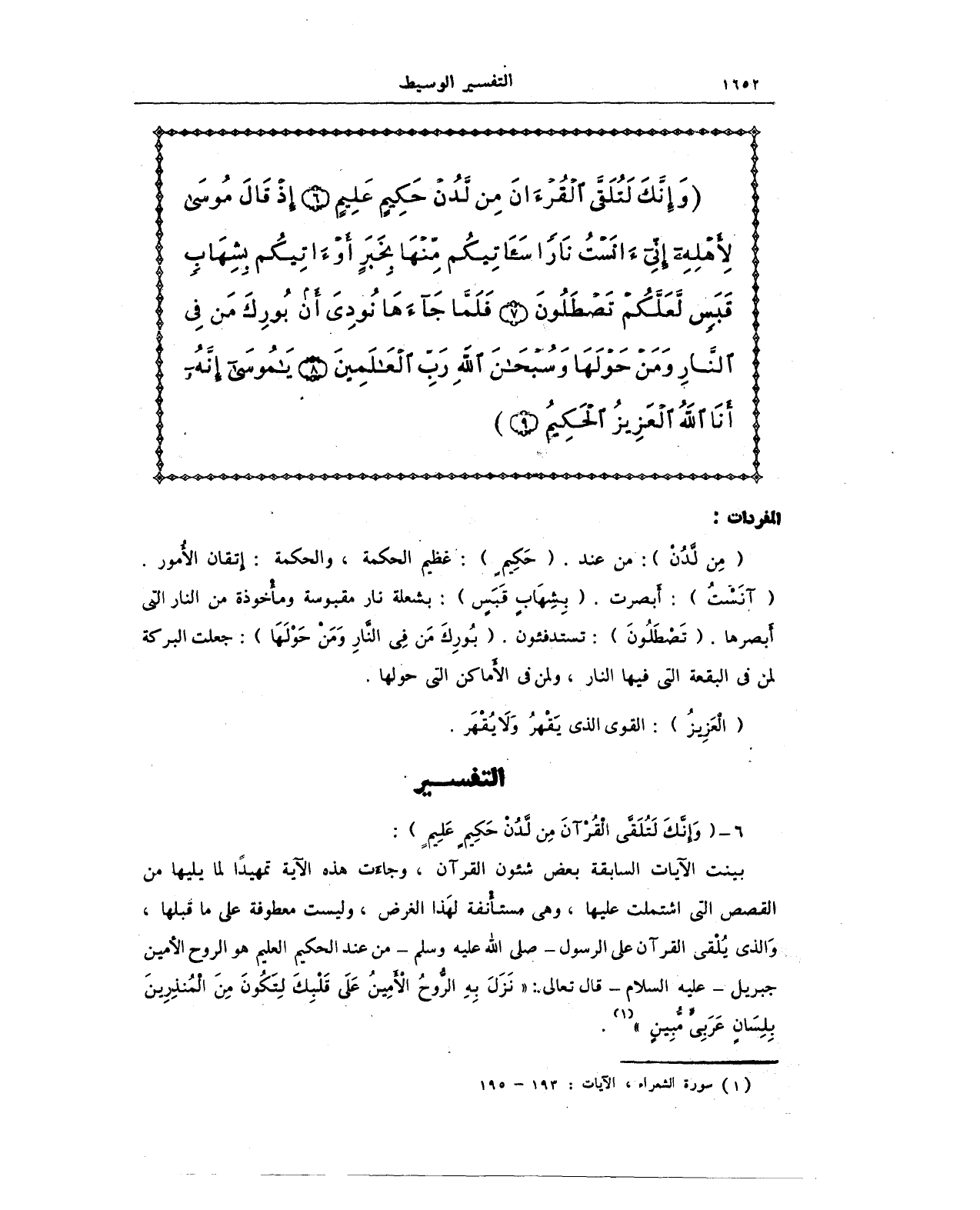 {وَإِنَّكَ لَتُلَقَّى الْقُرْآنَ مِنْ لَدُنْ حَكِيمٍ عَلِيمٍ (6) إِذْ قَالَ مُوسَى لِأَهْلِهِ إِنِّي آنَسْتُ نَارًا سَآتِيكُمْ مِنْهَا بِخَبَرٍ أَوْ آتِيكُمْ بِشِهَابٍ قَبَسٍ لَعَلَّكُمْ تَصْطَلُونَ (7) فَلَمَّا جَاءَهَا نُودِيَ أَنْ بُورِكَ مَنْ فِي النَّارِ وَمَنْ حَوْلَهَا وَسُبْحَانَ اللَّهِ رَبِّ الْعَالَمِينَ (8) يَا مُوسَى إِنَّهُ أَنَا اللَّهُ الْعَزِيزُ الْحَكِيمُ (9)}