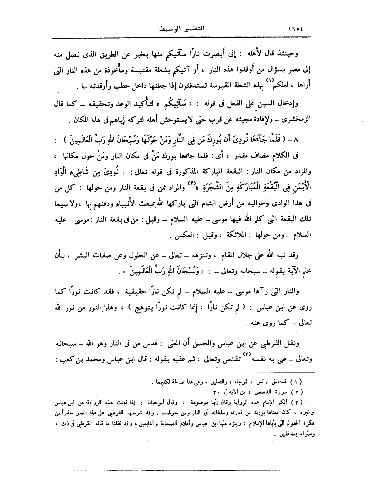 (¬3) أَنكر الإِمام هذه الرواية وقال إنها موضوعة، وقال أبو حيان: إذا ثبتت هذه الرواية عن ابن عباس وغيره، كان معناها بورك من قدرته وسلطانه في النار ومن حولها. وقد شرحها القرطبي على هذا النحو حذرًا من فكرة الحلول التي يأباها الإِسلام، وينزه عنها ابن عباس وأعلام الصحابة والتابعين، وقد نقلنا ما قاله القرطبي في ذلك، وستراه بعد قليل.
