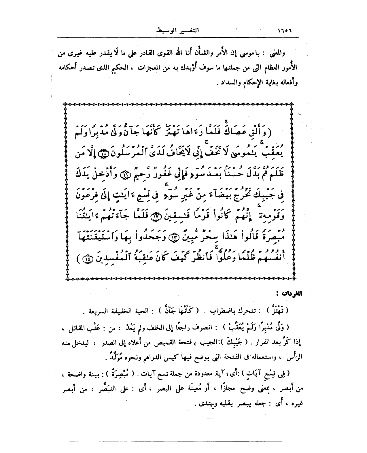 {وَلَّى مُدْبِرًا وَلَمْ يُعَقِّبْ}: انصرف راجعًا إِلى الخلف ولم يَعُدْ، من: عَقَّب المقاتل، إذا كَرَّ بعد الفرار. {جَيْبِكَ}: الجيب؛ فتحة القميص من أَعلاه إِلى الصدر، ليدخل منه الرأْس، واستعماله في الفتحة التي يوضع فيها كيس الدراهم ونحوه مُوَلَّدٌ.