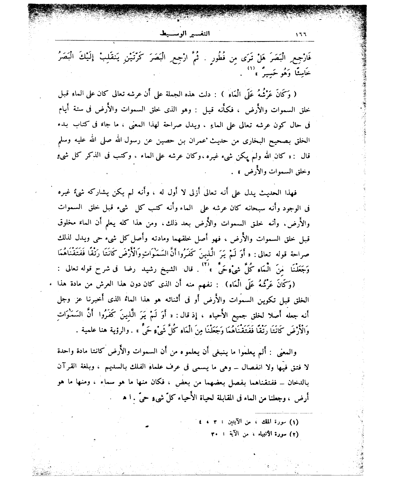 فهذا الحديث يدل على أَنه تعالى أزلى لا أَول له، وأَنه لم يكن يشاركه شىءٌ غيره في الوجود وأَنه سبحانه كان عرشه على الماء وأنه كتب كل شيء قبل خلق السموات والأَرض، وأنه خلق السموات والأرض بعد ذلك، ومن هذا كله يعلم أن الماءَ مخلوق قبل خلق السموات والأرض، فهو أَصل خلقهما ومادته وأَصل كل شيء حى ويدل لذلك صراحة قوله تعالى: {أَوَلَمْ يَرَ الَّذِينَ كَفَرُوا أَنَّ السَّمَاوَاتِ وَالْأَرْضَ كَانَتَا رَتْقًا فَفَتَقْنَاهُمَا وَجَعَلْنَا مِنَ الْمَاءِ كُلَّ شَيْءٍ حَيٍّ} (¬2). قال الشيخ رشيد رضا في شرح قوله تعالى: {وَكَانَ عَرْشُهُ عَلَى الْمَاءِ}: نفهم منه أن الذي كان دون هذا العرش من مادة هذا الخلق قبل تكوين السموات والأَرض أو في أَثنائه هو هذا الماءُ الذي أخبرنا عز وجل أَنه جعله أصلا لخلق جميع الأحياءِ، إِذ قال: {أَوَلَمْ يَرَ الَّذِينَ كَفَرُوا أَنَّ السَّمَاوَاتِ وَالْأَرْضَ كَانَتَا رَتْقًا فَفَتَقْنَاهُمَا وَجَعَلْنَا مِنَ الْمَاءِ كُلَّ شَيْءٍ حَيٍّ}. والرؤية هنا علمية.