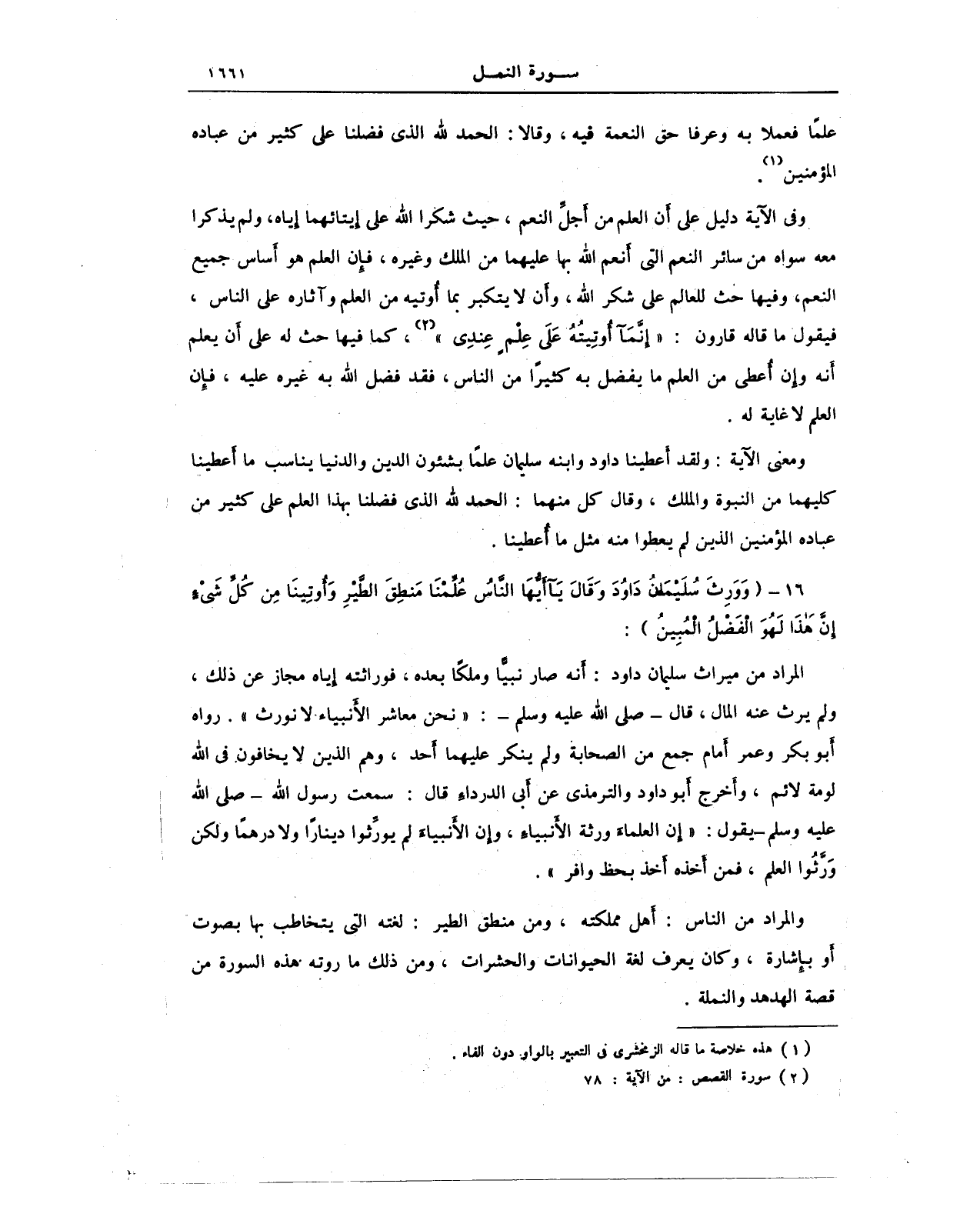ومعنى الآية: ولقد أعطينا داود وابنه سليمان علمًا بشئون الدين والدنيا يناسب ما أَعطينا كليهما من النبوة والملك، وقال كل منهما: الحمد لله الذي فضلنا بهذا العلم على كثير من عباده المؤمنين الذين لم يعطوا منه مثل ما أعطينا.