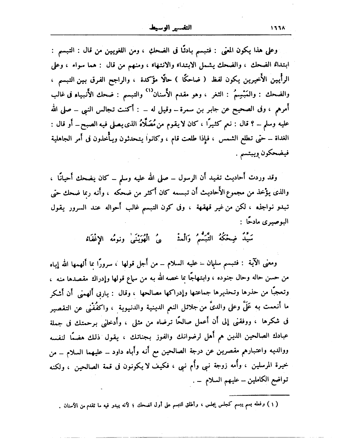 وعلى هذا يكون المعنى: فتبسم بادئًا في الضحك، ومن اللغويين من قال: التبسم: ابتداءُ الضحك، والضحك يشمل الابتداءَ والانتهاءَ، ومنهم من قال: هما سواء، وعلى الرأيين الأخيرين يكون لفظ (ضاحكًا) حالًا مؤكدة، والراجح الفرق بين التبسم، والضحك: والمَبْسِمُ: الثغر، وهو مقدم الأسنان (¬1) والتبسم: ضحك الأَنبياء في غالب أَمرهم، وفي الصحيح عن جابر بن سمرة - وقيل له -: أَكنت تجالس النبي - صلى الله عليه وسلم -؟ قال: نعم كثيرًا، كان لا يقوم من مُصَلَّاهُ الذي يصلى فيه الصبح - أَو قال: الغداة - حتى تطلع الشمس، فإِذا طلعت قام، وكانوا يتحدثون ويأْخذون في أَمر الجاهلية فيضحكون ويبتسم.