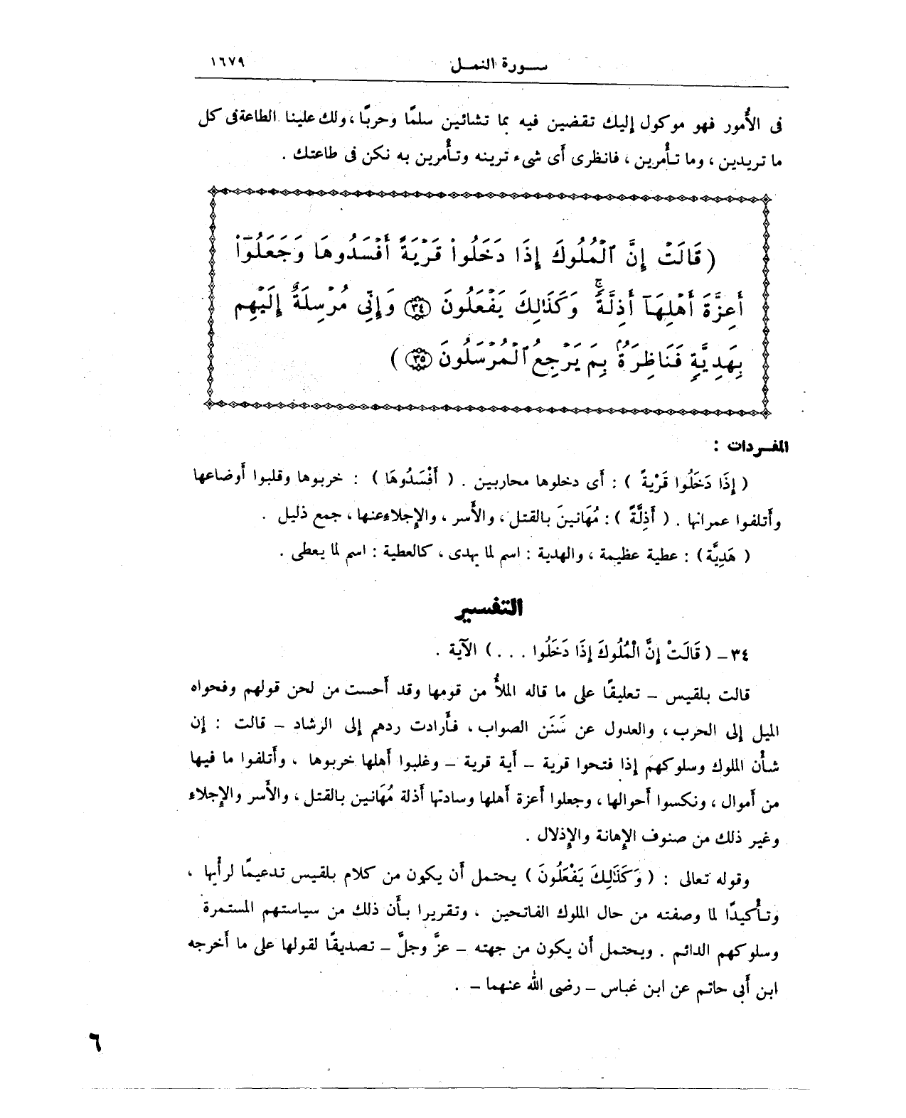قالت بلقيس - تعليقًا على ما قاله الملأَ من قومها وقد أَحست من لحن قولهم وفحواه الميل إلى الحرب، والعدول عن سَنَن الصواب، فأَرادت ردهم إلى الرشاد - قالت: إِن شأْن الملوك وسلوكهم إذا فتحوا قرية - أية قرية - وغلبوا أهلها - خربوها، وأتلفوا ما فيها من أَموال، ونكسوا أحوالها، وجعلوا أعزة أهلها وسادتها أذلة مُهَانين بالقتل، والأسر والإِجلاءِ وغير ذلك من صنوف الإهانة والإذلال.