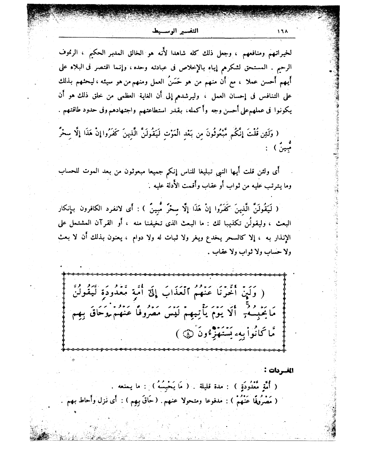 {وَلَئِنْ أَخَّرْنَا عَنْهُمُ الْعَذَابَ إِلَى أُمَّةٍ مَعْدُودَةٍ لَيَقُولُنَّ مَا يَحْبِسُهُ أَلَا يَوْمَ يَأْتِيهِمْ لَيْسَ مَصْرُوفًا عَنْهُمْ وَحَاقَ بِهِمْ مَا كَانُوا بِهِ يَسْتَهْزِئُونَ}