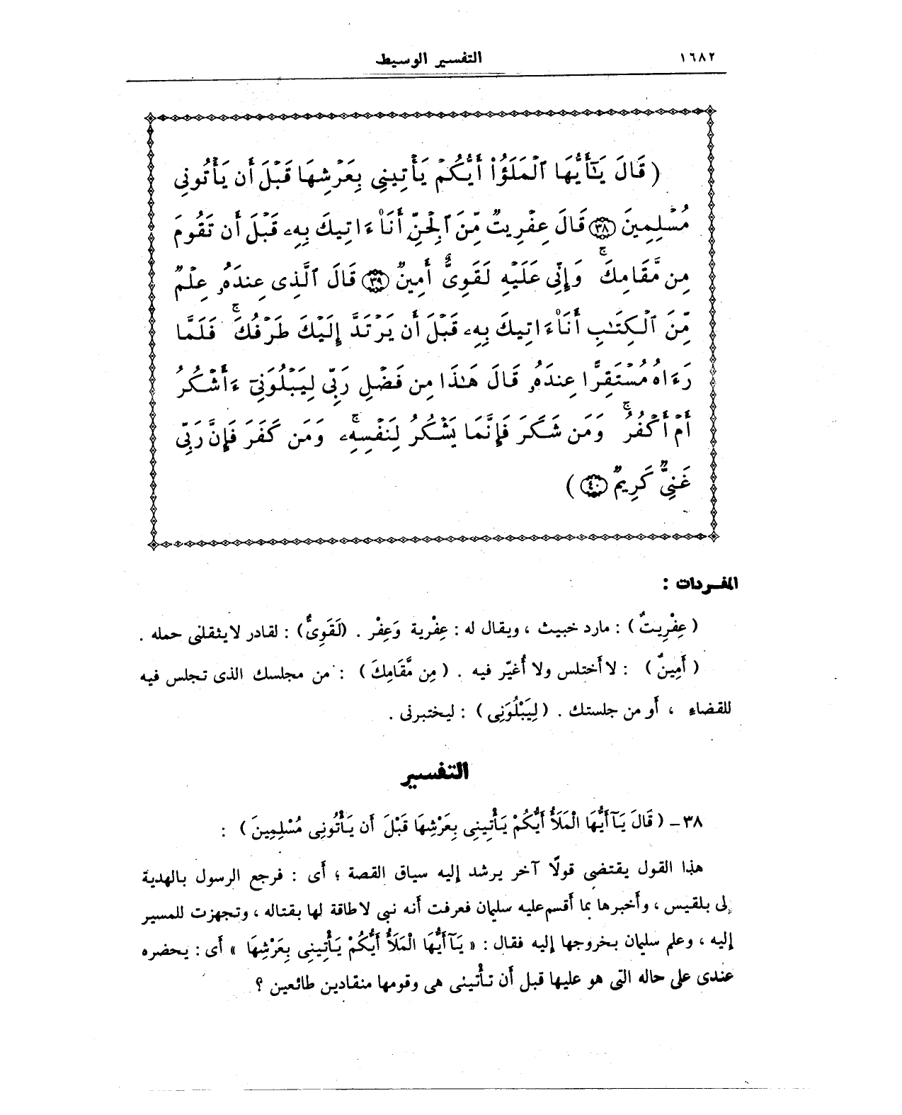 {قَالَ يَا أَيُّهَا الْمَلَأُ أَيُّكُمْ يَأْتِينِي بِعَرْشِهَا قَبْلَ أَنْ يَأْتُونِي مُسْلِمِينَ (38) قَالَ عِفْرِيتٌ مِنَ الْجِنِّ أَنَا آتِيكَ بِهِ قَبْلَ أَنْ تَقُومَ مِنْ مَقَامِكَ وَإِنِّي عَلَيْهِ لَقَوِيٌّ أَمِينٌ (39) قَالَ الَّذِي عِنْدَهُ عِلْمٌ مِنَ الْكِتَابِ أَنَا آتِيكَ بِهِ قَبْلَ أَنْ يَرْتَدَّ إِلَيْكَ طَرْفُكَ فَلَمَّا رَآهُ مُسْتَقِرًّا عِنْدَهُ قَالَ هَذَا مِنْ فَضْلِ رَبِّي لِيَبْلُوَنِي أَأَشْكُرُ أَمْ أَكْفُرُ وَمَنْ شَكَرَ فَإِنَّمَا يَشْكُرُ لِنَفْسِهِ وَمَنْ كَفَرَ فَإِنَّ رَبِّي غَنِيٌّ كَرِيمٌ (40)}