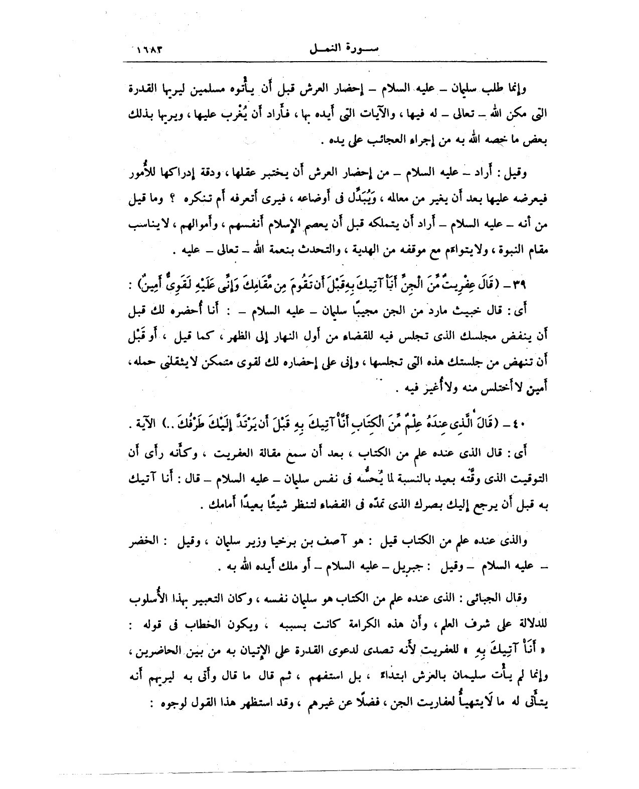 وقال الجبائى: الذي عنده علم من الكتاب هو سليمان نفسه، وكان التعبير بهذا الأُسلوب للدلالة على شرف العلم، وأن هذه الكرامة كانت بسببه، ويكون الخطاب في قوله: {أَنَا آتِيكَ بِهِ} للعفريت لأنه تصدى لدعوى القدرة على الإتيان به من بين الحاضرين، وإنما لم يأْت سليمان بالعرش ابتداءً، بل استفهم، ثم قال ما قال وأَتى به ليريهم أنه يتأَتى له ما لا يتهيأُ لعفاريت الجن، فضلًا عن غيرهم، وقد استظهر هذا القول لوجوه: