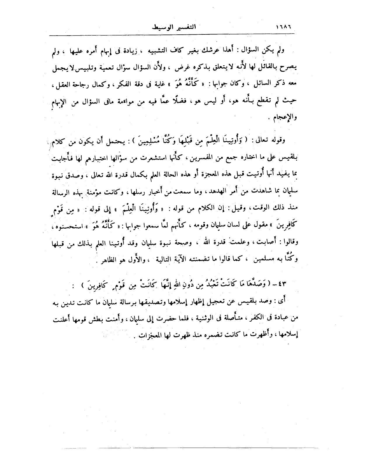 وقوله تعالى: {وَأُوتِينَا الْعِلْمَ مِنْ قَبْلِهَا وَكُنَّا مُسْلِمِينَ}: يحتمل أن يكون من كلام بلقيس على ما اختاره جمع من المفسرين، كأَنها استشعرت من سؤالها اختيارهم لها فأَجابت بما يفيد أنها أُوتيت قبل هذه المعجزة أو هذه الحالة العلم بكمال قدرة الله تعالى، وصدق نبوة سليمان بما شاهدت من أمر الهدهد، وما سمعت من أخبار رسلها، وكانت مؤمنة بهذه الرسالة منذ ذلك الوقت، وقيل: إن الكلام من قوله: {وَأُوتِينَا الْعِلْمَ} إلى قوله: {مِنْ قَوْمٍ كَافِرِينَ} مقول على لسان سليمان وقومه، كأنهم لمَّا سمعوا جوابها: {كَأَنَّهُ هُوَ} استحسنوه، وقالوا: أصابت، وعلمت قدرة الله، وصحة نبوة سليمان وقد أوتينا العلم بذلك من قبلها وكُنَّا به مسلمين، كما قالوا ما تضمنته الآية التالية، والأول هو الظاهر.