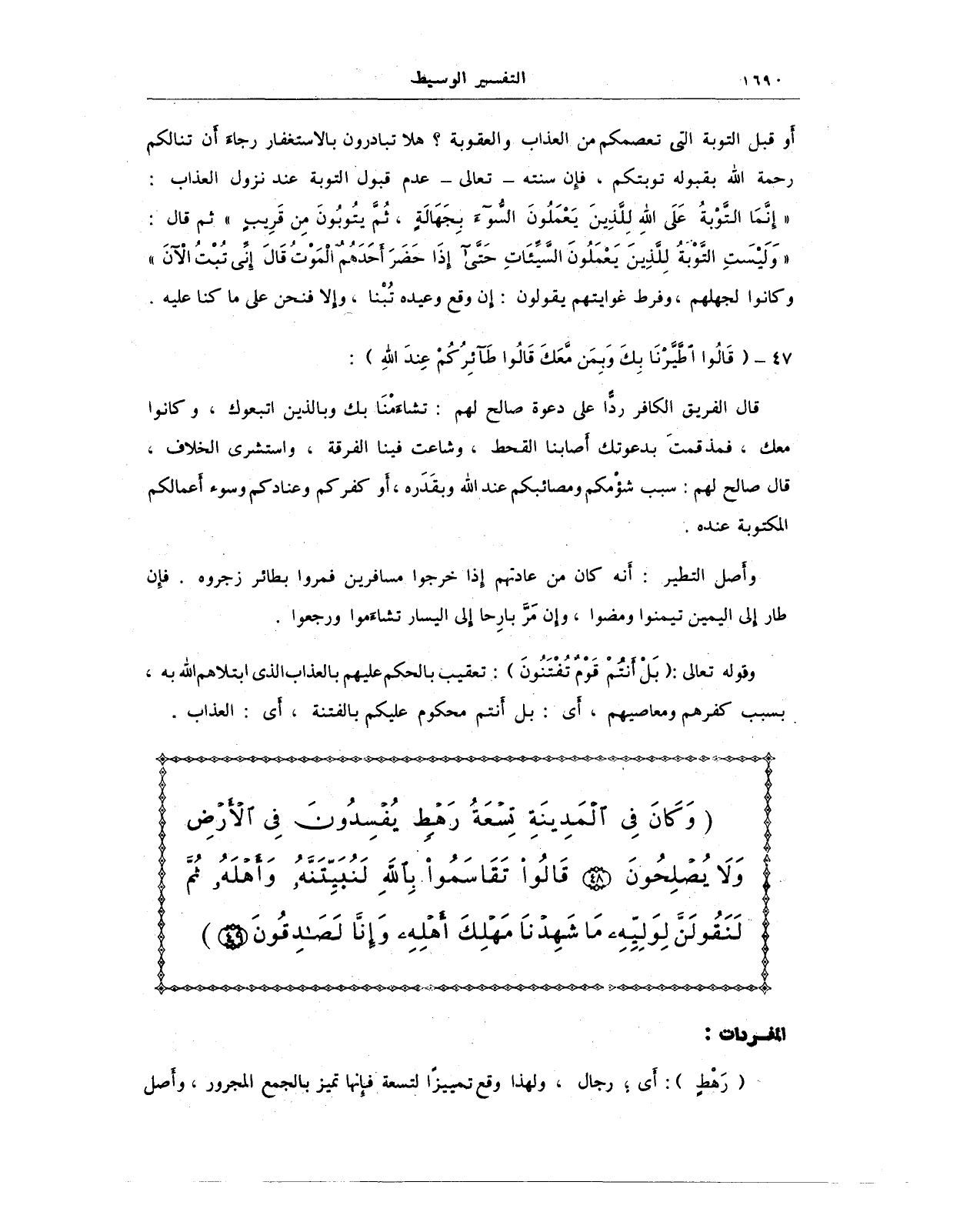 قال الفريق الكافر ردًّا على دعوة صالح لهم: تشاءَمنَا بك وبالذين اتبعوك، وكانوا معك، فمذقمتَ بدعوتك أَصابنا القحط، وشاعت فينا الفرقة، واستشرى الخلاف، قال صالح لهم: سبب شؤْمكم ومصائبكم عند الله وبقَدَره، أو كفركم وعنادكم وسوء أعمالكم المكتوبة عنده.