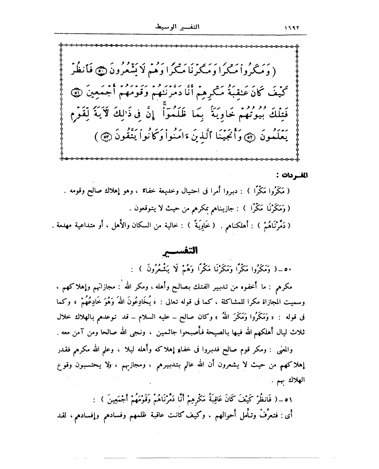 مكرهم: ما أَخفوه من تدبير الفتك بصالح وأَهله، ومكر الله: مجازاتهم وإهلاكهم، وسميت المجازاة مكرا للمشاكلة، كما في قوله تعالى: {يُخَادِعُونَ اللَّهَ وَهُوَ خَادِعُهُمْ} وكما في قوله: {ومَكَرُوا وَمَكَرَ اللَّهُ} وكان صالح - عليه السلام - قد توعدهم بالهلاك خلال ثلاث ليال أهلكهم الله فيها بالصيحة فأصبحوا جاثمين، ونجى الله صالحا ومن آمن معه.