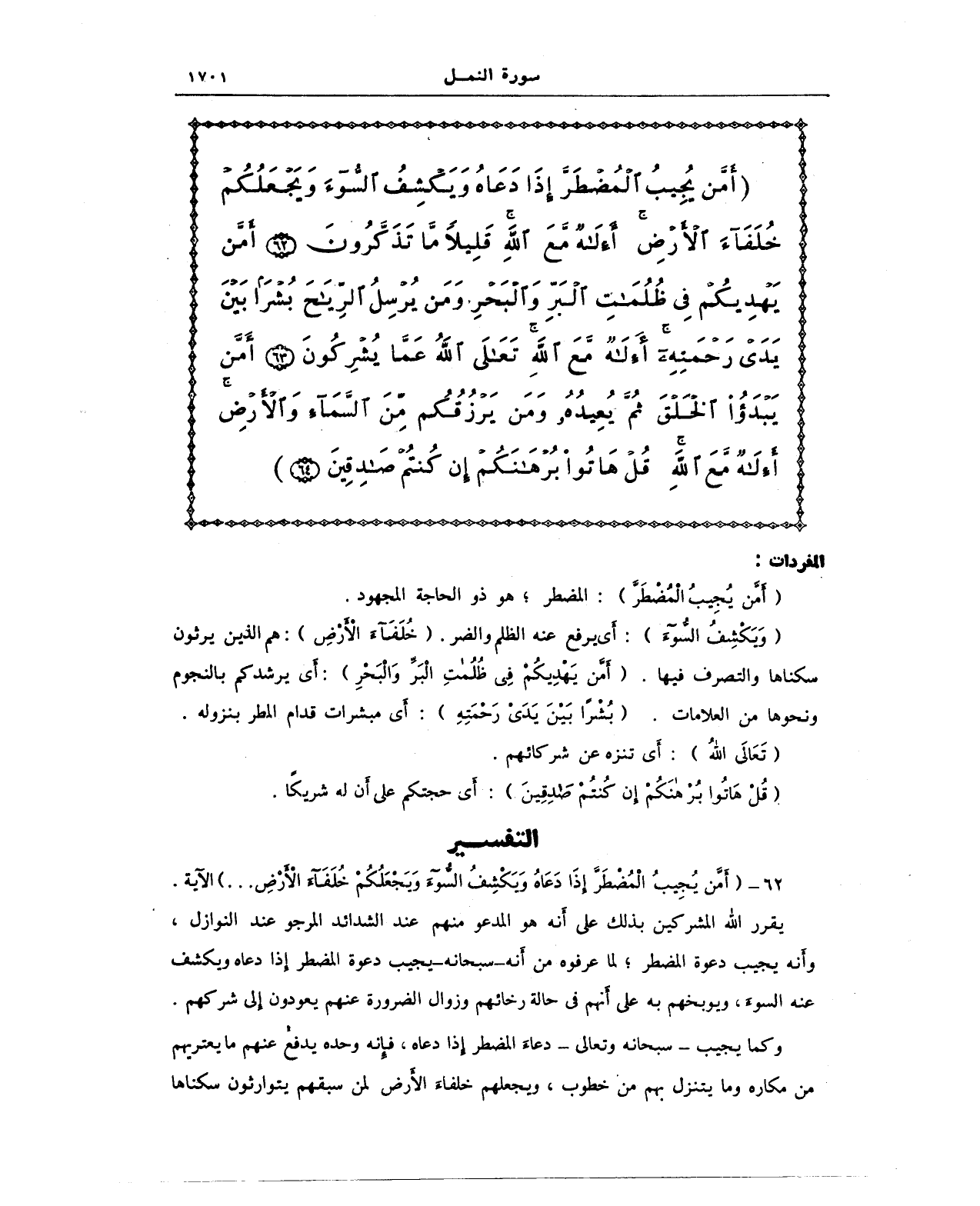 {وَيَكْشِفُ السُّوءَ}: أي يرفع عنه الظلم والضر. {خُلَفَاءَ الْأَرْضِ}: هم الذين يرثون سكناها والتصرف فيها. {أَمَّنْ يَهْدِيكُمْ فِي ظُلُمَاتِ الْبَرِّ وَالْبَحْرِ}: أي يرشدكم بالنجوم ونحوها من العلامات. {بُشْرًا بَيْنَ يَدَيْ رَحْمَتِهِ}: أي مبشرات قدام المطر بنزوله.