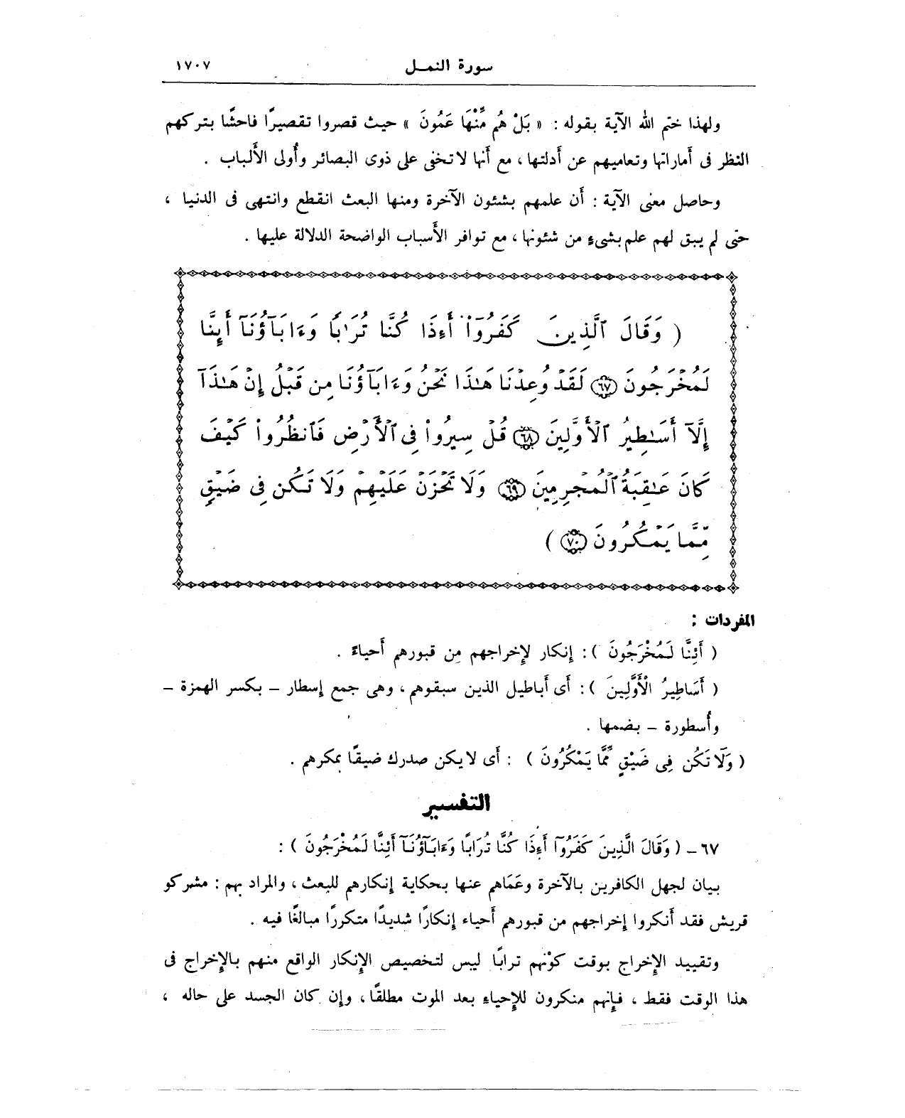 {وَقَالَ الَّذِينَ كَفَرُوا أَإِذَا كُنَّا تُرَابًا وَآبَاؤُنَا أَئِنَّا لَمُخْرَجُونَ (67) لَقَدْ وُعِدْنَا هَذَا نَحْنُ وَآبَاؤُنَا مِنْ قَبْلُ إِنْ هَذَا إِلَّا أَسَاطِيرُ الْأَوَّلِينَ (68) قُلْ سِيرُوا فِي الْأَرْضِ فَانْظُرُوا كَيْفَ كَانَ عَاقِبَةُ الْمُجْرِمِينَ (69) وَلَا تَحْزَنْ عَلَيْهِمْ وَلَا تَكُنْ فِي ضَيْقٍ مِمَّا يَمْكُرُونَ (70)}