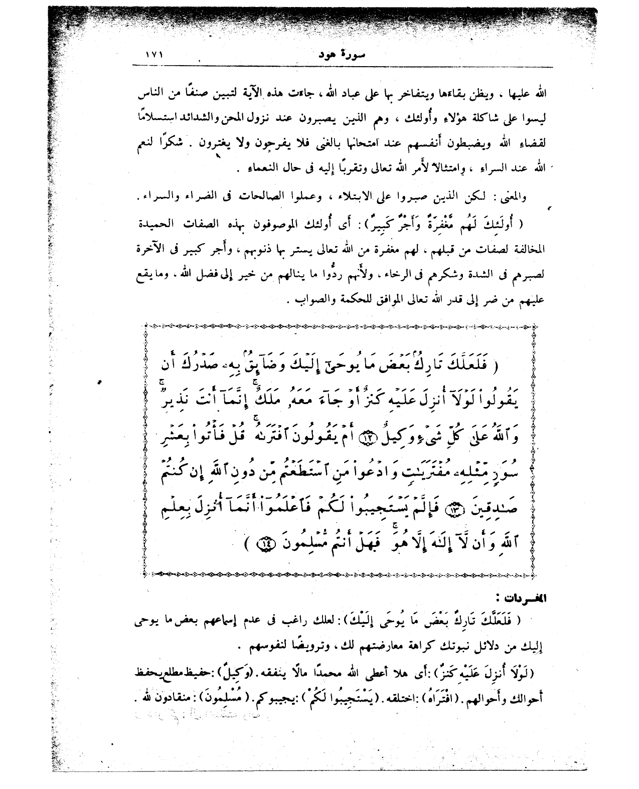 {فَلَعَلَّكَ تَارِكٌ بَعْضَ مَا يُوحَى إِلَيْكَ وَضَائِقٌ بِهِ صَدْرُكَ أَنْ يَقُولُوا لَوْلَا أُنْزِلَ عَلَيْهِ كَنْزٌ أَوْ جَاءَ مَعَهُ مَلَكٌ إِنَّمَا أَنْتَ نَذِيرٌ وَاللَّهُ عَلَى كُلِّ شَيْءٍ وَكِيلٌ (12) أَمْ يَقُولُونَ افْتَرَاهُ قُلْ فَأْتُوا بِعَشْرِ سُوَرٍ مِثْلِهِ مُفْتَرَيَاتٍ وَادْعُوا مَنِ اسْتَطَعْتُمْ مِنْ دُونِ اللَّهِ إِنْ كُنْتُمْ صَادِقِينَ (13) فَإِلَّمْ يَسْتَجِيبُوا لَكُمْ فَاعْلَمُوا أَنَّمَا أُنْزِلَ بِعِلْمِ اللَّهِ وَأَنْ لَا إِلَهَ إِلَّا هُوَ فَهَلْ أَنْتُمْ مُسْلِمُونَ}