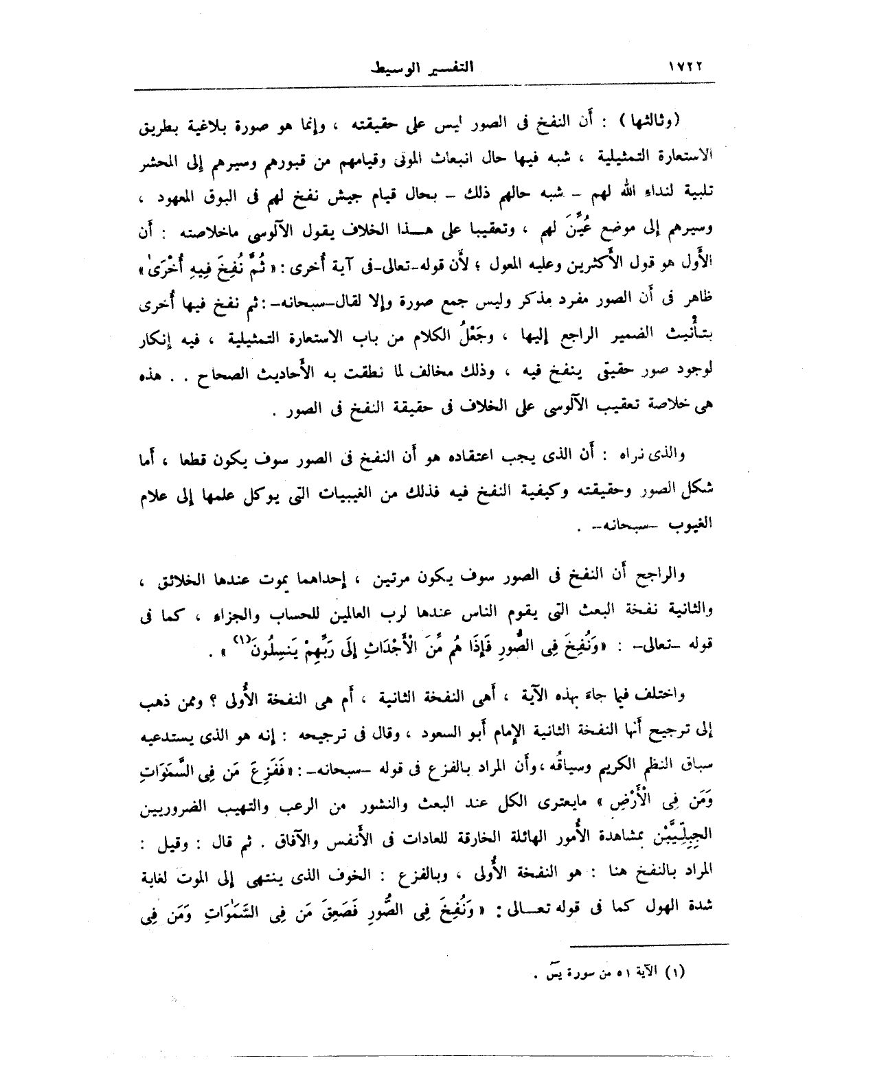 (وثالثها): أَن النفخ في الصور على حقيقته، وإنما هو صورة بلاغية بطريق الاستعارة التمثيلية، شبه فيها حال انبعاث الموتى وقيامهم من قبورهم وسيرهم إلى المحشر تلبية لنداء الله لهم - شبه حالهم ذلك - بحال قيام جيش نفخ لهم في البوق المعهود، وسيرهم إلى موضع عُيِّنَ لهم، وتعقيبا على هذا الخلاف يقول الآلوسى ما خلاصته: أن الأول في قول الأكثرين وعليه المعول؛ لأن قوله - تعالى - في آية أخرى: {ثُمَّ نُفِخَ فِيهِ} ظاهر في أن الصور مفرد مذكر وليس جمع صورة وإلا لقال - سبحانه -: ثم نفخ فيها أخرى بتأْنيث الضمير الراجع إليها، وجَعْلُ الكلام من باب الاستعارة التمثيلية، فيه إنكار لوجود صور حقيقى ينفخ فيه، وذلك مخالف لما نطقت به الأحاديث الصحاح .. هذه هي خلاصه تعقيب الآلوسى على الخلاف في حقيقة النفخ في الصور.