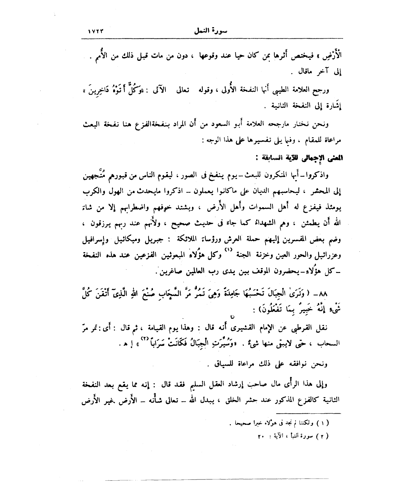 ورجح العلامة الطيبى أنها النفخة الأولى، وقوله تعالى الآتى: {وَكُلٌّ أَتَوْهُ دَاخِرِينَ} إشارة إلى النفخة الثانية.