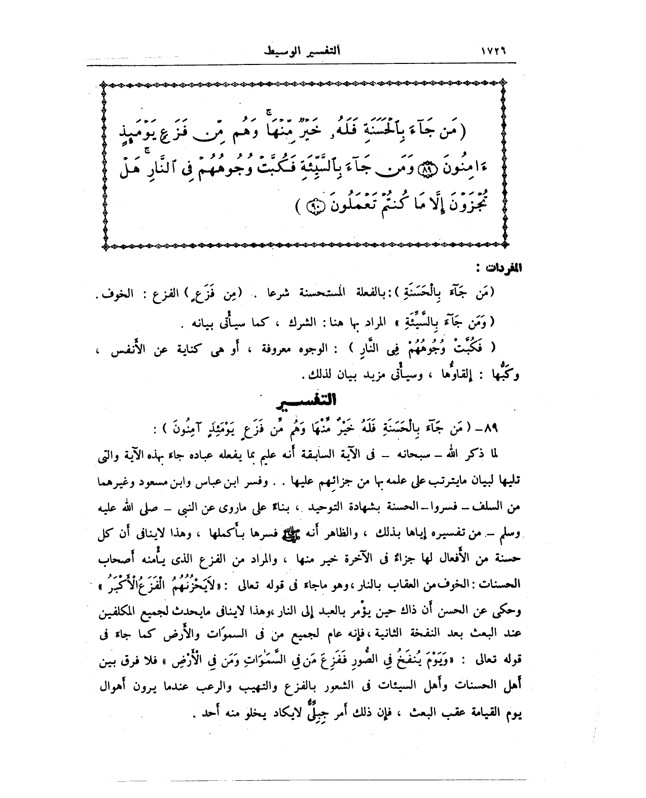 لما ذكر الله - سبحانه - في الآية السابقة أنه عليم بما يفعله عباده جاء بهذه الآية والتى تليها لبيان ما يترتب على علمه بها من جزائِهم عليها .. وفسر ابن عباس وابن مسعود وغيرهما من السلف - فسروا - الحسنة بشهادة التوحيد، بناء على ما روى عن النبي - صلى الله عليه وسلم - من تفسيره إياها بذلك، والظاهر أنه - صلى الله عليه وسلم - فسرها بأكملها، وهذا لا ينافى أن كل حسنة من الأفعال لها جزاءٌ في الآخرة خير منها، والمراد من الفزع الذي يأمنه أصحاب الحسنات: الخوف من العقاب بالنار، وهو ما جاء في قوله تعالى: {لَا يَحْزُنُهُمُ الْفَزَعُ الْأَكْبَرُ} وحكى عن الحسن أن ذاك حين يؤمر بالعبد إلى النار, وهذا لا ينافى ما يحدث لجميع المكلفين عند البعث بعد النفخة الثانية، فإنه عام لجميع من في السموات والأرض كما جاء في قوله تعالى: {وَيَوْمَ يُنْفَخُ فِي الصُّورِ فَفَزِعَ مَنْ فِي السَّمَاوَاتِ وَمَنْ فِي الْأَرْضِ} فلا فرق بين أهل الحسنات وأهل السيئات في الشعور بالفزع والتهيب والرعب عندما يرون أهوال يوم القيامة عقب البعث، فإن ذلك أمر جبلي لا يكاد يخلو منه أحد.