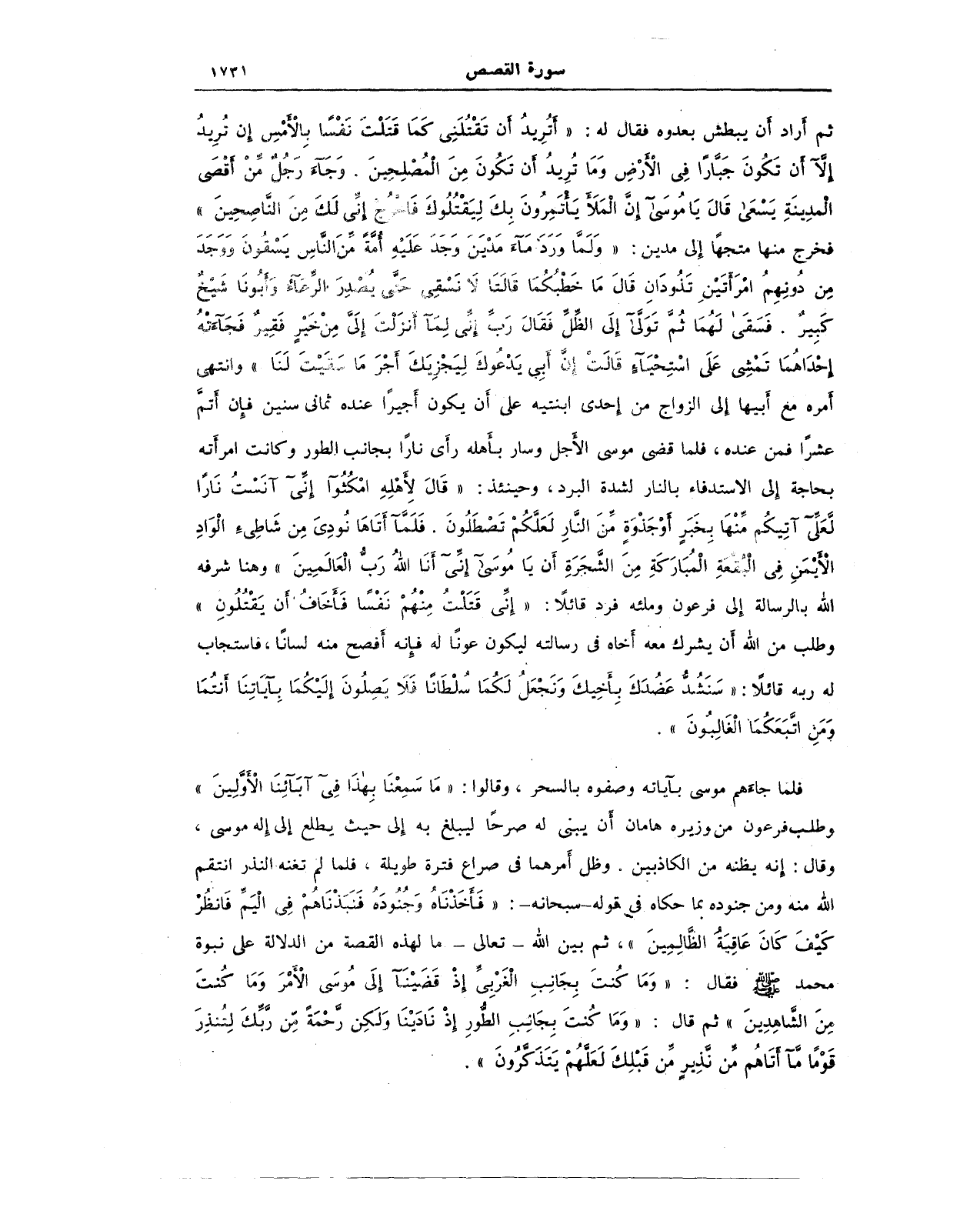 ثم أراد أن يبطش بعدوه فقال له: {أتُرِيدُ أَنْ تَقْتُلَنِي كَمَا قَتَلْتَ نَفْسًا بِالْأَمْسِ إِنْ تُرِيدُ إِلَّا أَنْ تَكُونَ جَبَّارًا فِي الْأَرْضِ وَمَا تُرِيدُ أَنْ تَكُونَ مِنَ الْمُصْلِحِينَ (19) وَجَاءَ رَجُلٌ مِنْ أَقْصَى الْمَدِينَةِ يَسْعَى قَالَ يَا مُوسَى إِنَّ الْمَلَأَ يَأْتَمِرُونَ بِكَ لِيَقْتُلُوكَ فَاخْرُجْ إِنِّي لَكَ مِنَ النَّاصِحِينَ} فخرج منها متجهًا إلى مدين: {وَلَمَّا وَرَدَ مَاءَ مَدْيَنَ وَجَدَ عَلَيْهِ أُمَّةً مِنَ النَّاسِ يَسْقُونَ وَوَجَدَ مِنْ دُونِهِمُ امْرَأَتَيْنِ تَذُودَانِ قَالَ مَا خَطْبُكُمَا قَالَتَا لَا نَسْقِي حَتَّى يُصْدِرَ الرِّعَاءُ وَأَبُونَا شَيْخٌ كَبِيرٌ (23) فَسَقَى لَهُمَا ثُمَّ تَوَلَّى إِلَى الظِّلِّ فَقَالَ رَبِّ إِنِّي لِمَا أَنْزَلْتَ إِلَيَّ مِنْ خَيْرٍ فَقِيرٌ (24) فَجَاءَتْهُ إِحْدَاهُمَا تَمْشِي عَلَى اسْتِحْيَاءٍ قَالَتْ إِنَّ أَبِي يَدْعُوكَ لِيَجْزِيَكَ أَجْرَ مَا سَقَيْتَ لَنَا} وانتهى أمره مع أبيها إلى الزواج من إحدى ابنتيه على أن يكون أجيرا عنده ثماني سنين فإن أتم عشرًا فمن عنده، فلما قضى موسى الأجل وسار بأهله رأى نارا بجانب الطور وكانت امرأته بحاجة إلى الاستدفاء بالنار لشدة البرد، وحينئذ: {قَالَ لِأَهْلِهِ امْكُثُوا إِنِّي آنَسْتُ نَارًا لَعَلِّي آتِيكُمْ مِنْهَا بِخَبَرٍ أَوْ جَذْوَةٍ مِنَ النَّارِ لَعَلَّكُمْ تَصْطَلُونَ (29) فَلَمَّا أَتَاهَا نُودِيَ مِنْ شَاطِئِ الْوَادِ الْأَيْمَنِ فِي الْبُقْعَةِ الْمُبَارَكَةِ مِنَ الشَّجَرَةِ أَنْ يَا مُوسَى إِنِّي أَنَا اللَّهُ رَبُّ الْعَالَمِينَ} وهنا شرفه الله بالرسالة إلى فرعون وملئه فرد قائلا: {إنِّي قَتَلْتُ مِنْهُمْ نَفْسًا فَأَخَافُ أَنْ يَقْتُلُونِ} وطلب من الله أن يشرك معه أخاه في رسالته ليكون عونًا له فإنه أفصح منه لسانا، فاستجاب له ربه قائلًا: {سَنَشُدُّ عَضُدَكَ بِأَخِيكَ وَنَجْعَلُ لَكُمَا سُلْطَانًا فَلَا يَصِلُونَ إِلَيْكُمَا بِآيَاتِنَا أَنْتُمَا وَمَنِ اتَّبَعَكُمَا الْغَالِبُونَ}.
