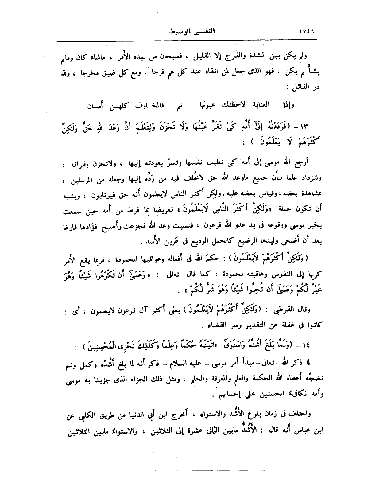 أرجع الله موسى إلى أُمه كي تطيب نفسها وتسرّ بعودته إليها, ولا تحزن بفراقه، ولتزداد علما بأن جميع ما وعد الله حق لا خُلف فيه من رده إليها وجعله من المرسلين, بمشاهدة بعضه، وقياس بعضه عليه، ولكن أكثر الناس لا يعلمون أنه حق فيرتابون، ويشبه أن تكون جملة {وَلَكِنَّ أَكْثَرَهُمْ لَا يَعْلَمُونَ} تعريضا بما فرط من أمه حين سمعت بخبر موسى ووقوعه في يد عدو الله فرعون، فنسيت وعد الله فجزعت وأصبح فؤادها فارغا بعد أن أضحى وليدها الرضيع كالحمل الوديع في عرين الأسد.