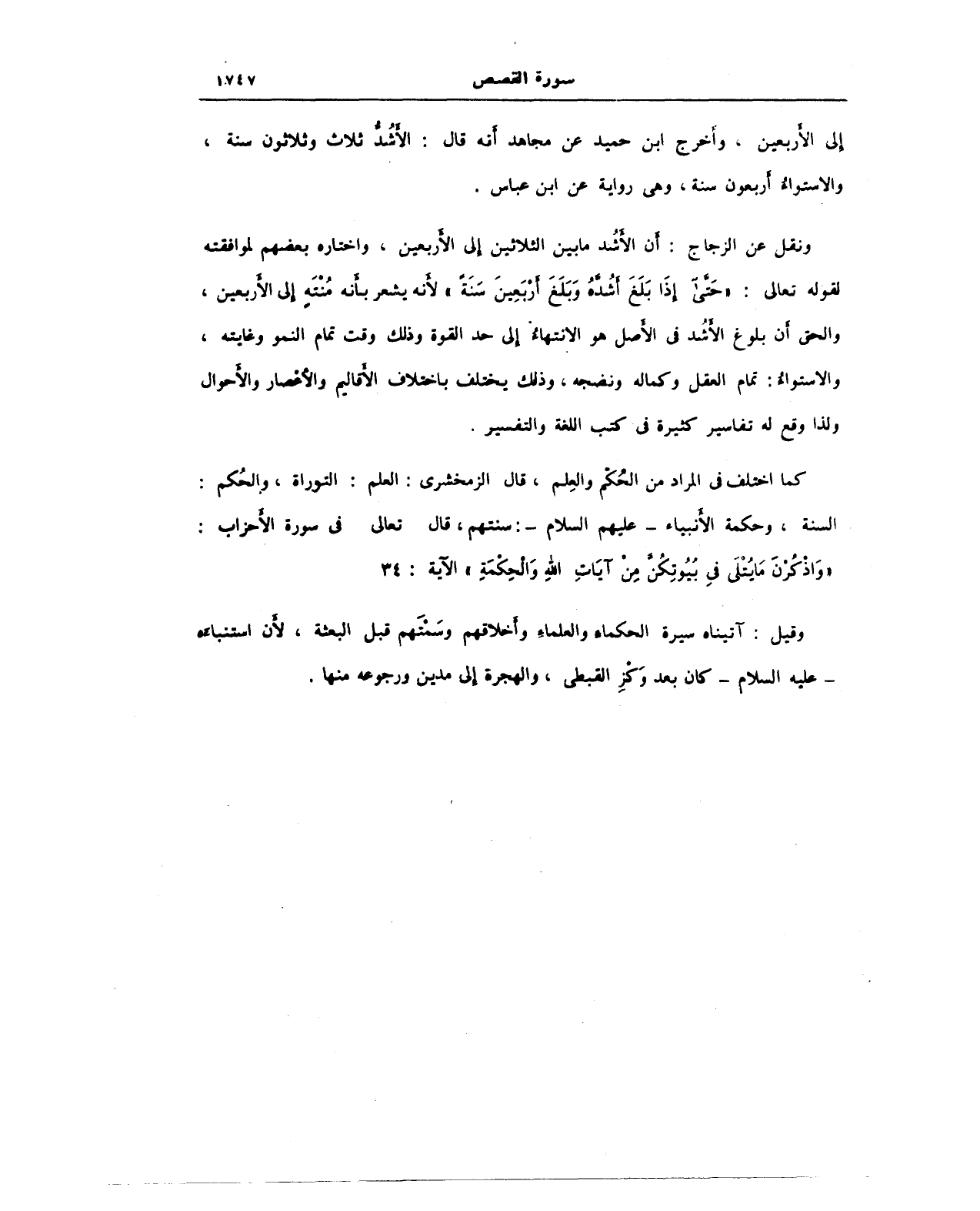 إلى الأربعين , وأخرج ابن حميد عن مجاهد أنه قال: الأشد ثلاث وثلاثون سنة، والاستواء أربعون سنة، وهي رواية عن ابن عباس.