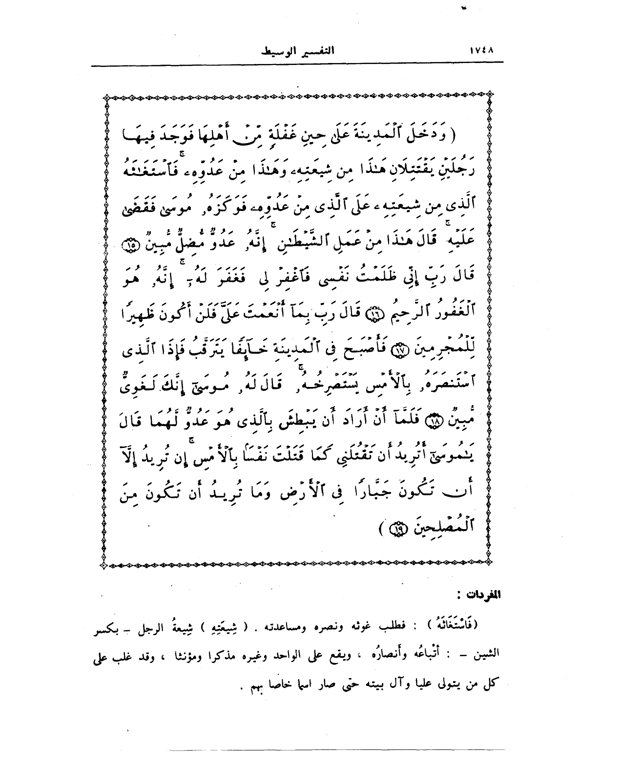 {وَدَخَلَ الْمَدِينَةَ عَلَى حِينِ غَفْلَةٍ مِنْ أَهْلِهَا فَوَجَدَ فِيهَا رَجُلَيْنِ يَقْتَتِلَانِ هَذَا مِنْ شِيعَتِهِ وَهَذَا مِنْ عَدُوِّهِ فَاسْتَغَاثَهُ الَّذِي مِنْ شِيعَتِهِ عَلَى الَّذِي مِنْ عَدُوِّهِ فَوَكَزَهُ مُوسَى فَقَضَى عَلَيْهِ قَالَ هَذَا مِنْ عَمَلِ الشَّيْطَانِ إِنَّهُ عَدُوٌّ مُضِلٌّ مُبِينٌ (15) قَالَ رَبِّ إِنِّي ظَلَمْتُ نَفْسِي فَاغْفِرْ لِي فَغَفَرَ لَهُ إِنَّهُ هُوَ الْغَفُورُ الرَّحِيمُ (16) قَالَ رَبِّ بِمَا أَنْعَمْتَ عَلَيَّ فَلَنْ أَكُونَ ظَهِيرًا لِلْمُجْرِمِينَ (17) فَأَصْبَحَ فِي الْمَدِينَةِ خَائِفًا يَتَرَقَّبُ فَإِذَا الَّذِي اسْتَنْصَرَهُ بِالْأَمْسِ يَسْتَصْرِخُهُ قَالَ لَهُ مُوسَى إِنَّكَ لَغَوِيٌّ مُبِينٌ (18) فَلَمَّا أَنْ أَرَادَ أَنْ يَبْطِشَ بِالَّذِي هُوَ عَدُوٌّ لَهُمَا قَالَ يَا مُوسَى أَتُرِيدُ أَنْ تَقْتُلَنِي كَمَا قَتَلْتَ نَفْسًا بِالْأَمْسِ إِنْ تُرِيدُ إِلَّا أَنْ تَكُونَ جَبَّارًا فِي الْأَرْضِ وَمَا تُرِيدُ أَنْ تَكُونَ مِنَ الْمُصْلِحِينَ (19)}