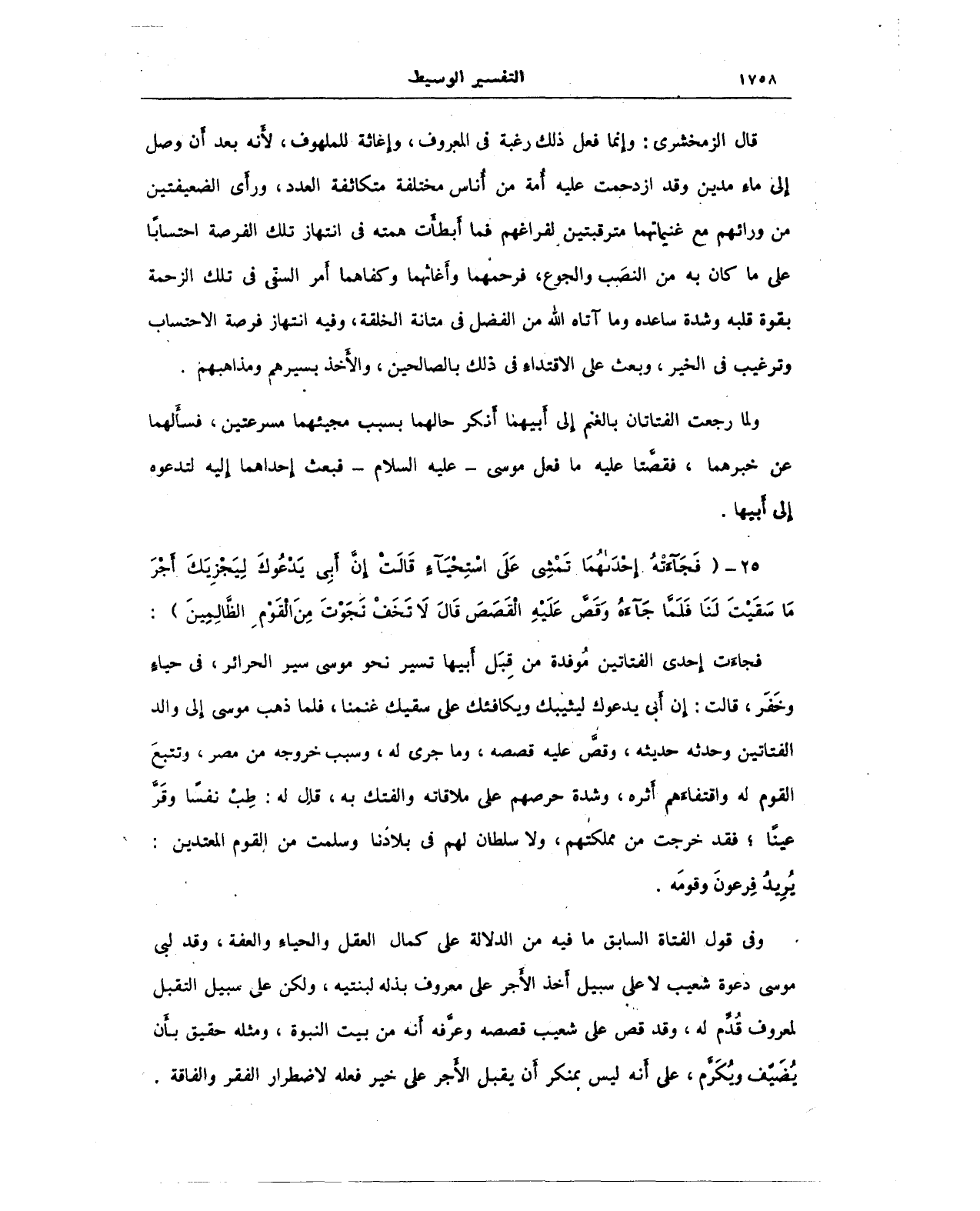 قال الزمخشرى: وإنما فعل ذلك رغبة في المعروف، وإغاثة للملهوف؛ لأنه بعد أن وصل إلى ماء مدين وقد ازدحمت عليه أمة من أناس مختلفة متكاثفة العدد، ورأى الضعيفتين من ورائهم مع غنيماتهما مترقبتين لفراغهم فما أبطأت همته في انتهاز تلك الفرصة احتسابا على ما كان به من النصَب والجوع، فرحمهما وأغاثهما وكفاهما أمر السقي في تلك الزحمة بقوة قلبه وشدة ساعده وما آتاه الله من الفضل في متانة الخلقة، وفيه انتهاز فرصة الاحتساب وترغيب في الخير، وبعث على الاقتداء في ذلك بالصالحين، والأخذ بسيرهم ومذاهبهم.