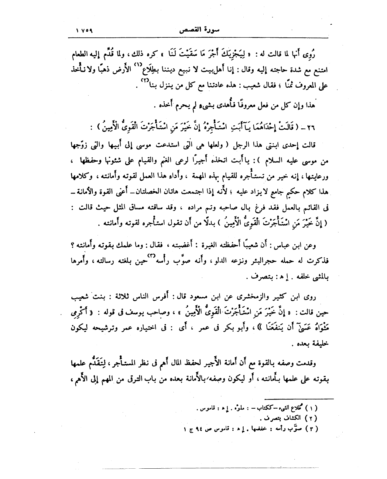 قالت إحدى ابنتي هذا الرجل (ولعلها هي التي استدعت موسى إلى أبيها والتي زوجها من موسى عليه السلام): يا أبت اتخذه أجيرًا لرعى الغنم والقيام على شئونها وحفظها، ورعايتها، إنه خير من تستأجره للقيام بهذه المهمة، وأداء هذا العمل لقوته وأمانته، وكلامها هذا كلام حكيم جامع لا يزاد عليه؛ لأنه إذا اجتمعت هاتان الخصلتان - أعني القوة والأمانة - في القائم بالعمل فقد فرغ بال صاحبه وتم مراده، وقد ساقته مساق المثل حيث قالت: {إنَّ خَيْرَ مَنِ اسْتَأْجَرْتَ الْقَوِيُّ الْأَمِينُ} بدلًا من أن تقول استأجره لقوته وأمانته.