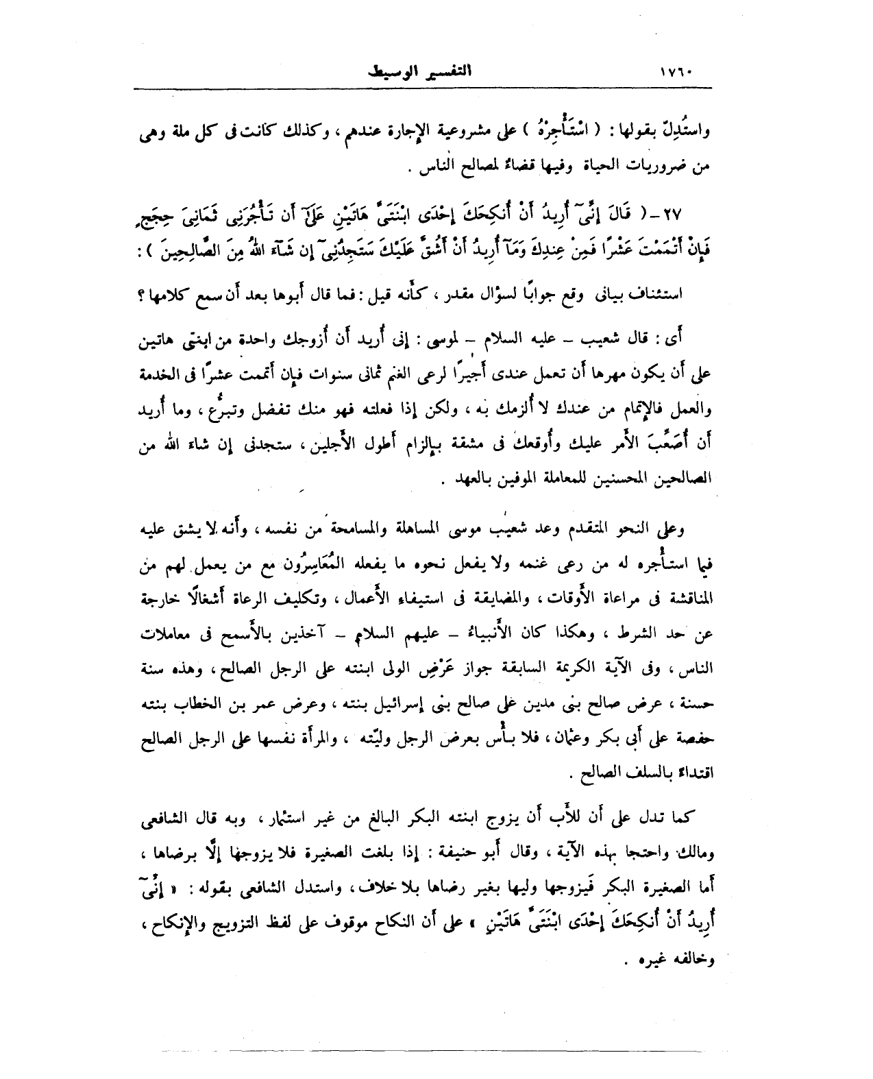 كما تدل على أن للأب أن يزوج ابنته البكر البالغ من غير استئمار، وبه قال الشافعي ومالك. واحتجا بهذه الآية، وقال أبو حنيفة: إذا بلغت الصغيرة فلا يزوجها إلاَّ برضاها، أما الصغيرة البكر فيزوجها وليها بغير رضاها بلا خلاف، واستدل الشافعي بقوله: {إِنِّي أُرِيدُ أَنْ أُنْكِحَكَ إِحْدَى ابْنَتَيَّ هَاتَيْنِ} على أن النكاح موقوف على لفظ التزويج والإنكاح، وخالفه غيره.